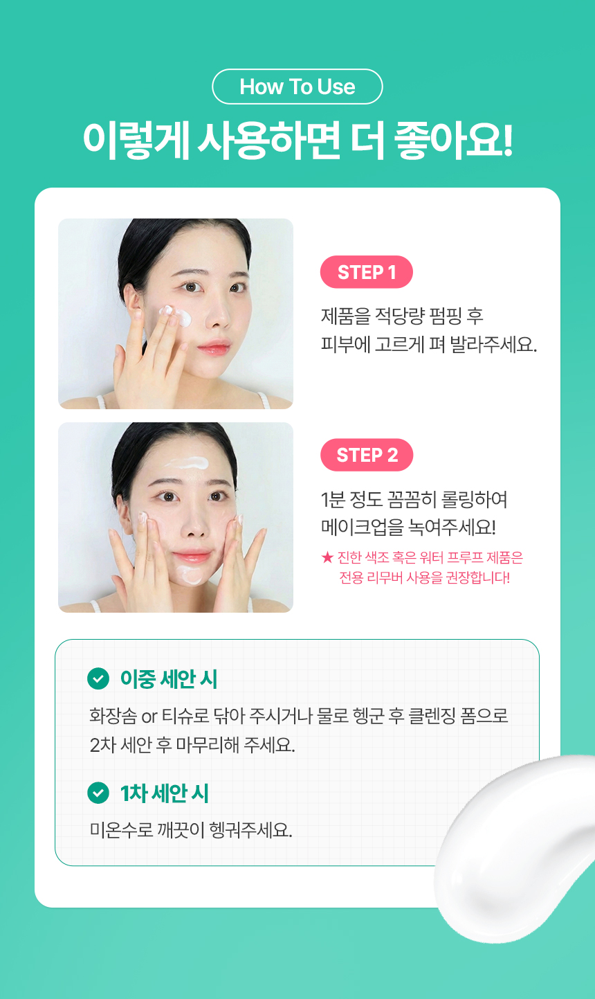 - Gently massage in circular motions to effectively dissolve makeup, sunscreen, and impurities.