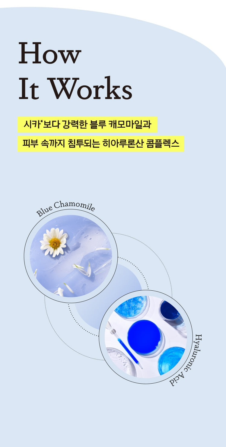 Blue chamomile, stronger than cica*, and hyaluronic acid complex that penetrates deep into the skin