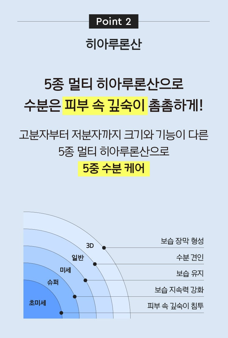 5 types of multi-hyaluronic acid with different sizes and functions, from high molecular weight to low molecular weight, for 5-fold moisture care