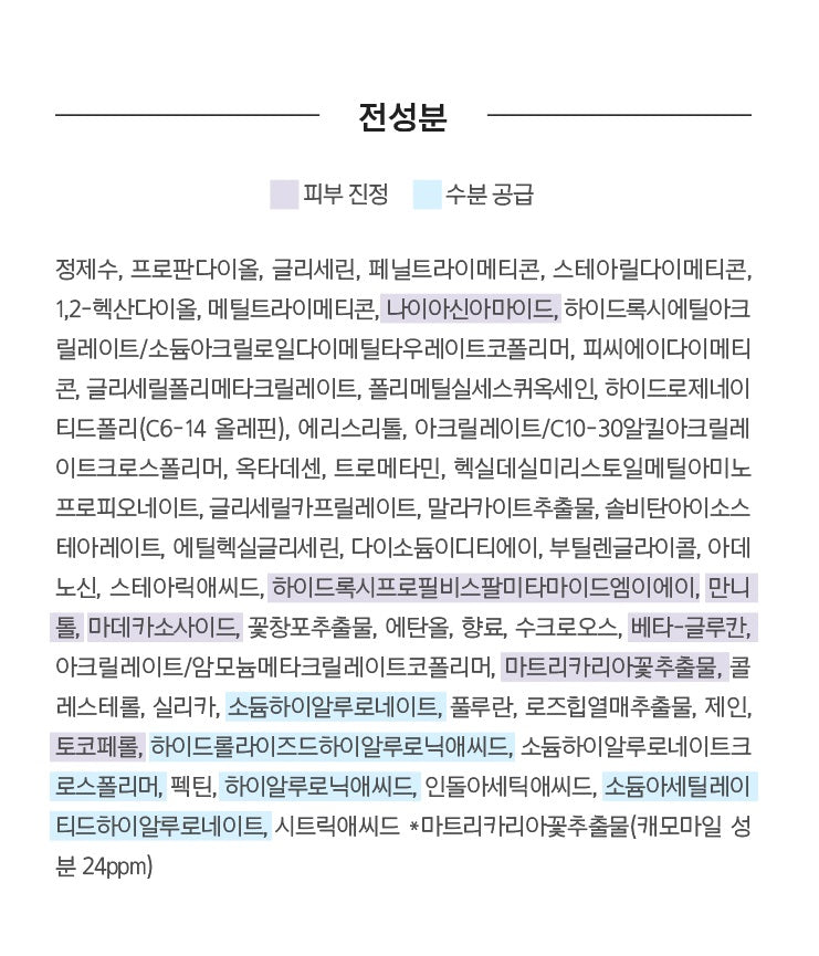 Purified water, propanediol, glycerin, phenyl trimethicone, stearyl dimethicone, 1,2-hexanediol, methyl trimethicone, niacinamide, hydroxyethyl acrylate/sodium acryloyldimethyl Taurate copolymer, PCA dimethicone, glyceryl polymethacrylate, polymethylsilsesquioxane, hydrogenated poly(C6-14 olefin), erythritol, acrylate/C10-30 yl acrylate crosspolymer , octadecene, tromethamine, hexyldecylmyristoylmethylamino propionate, glyceryl caprylate, malicite extract, sorbitan isostearate, ethylhexylglycerin, disodium EDTA, butylene glycol, Adenosine, stearic acid, hydroxypropylbispalmitamide MEA, mannitol madecassoside, iris extract, ethanol, flavoring, sucrose, beta-glucan, acrylate/ammonium methacrylate copolymer, Matricaria Flower extract, cholesterol, silica, sodium hyaluronate, pullulan, rosehip fruit extract, zein, tocopherol, hydrolyzed hyaluronic acid, sodium hyaluronate crosspolymer, pectin, hyaluronic acid ronic acid, indole acetic acid, sodium acetylated hyaluronate, citric acid Matricari lily flower extract (chamomile component 24ppm)
