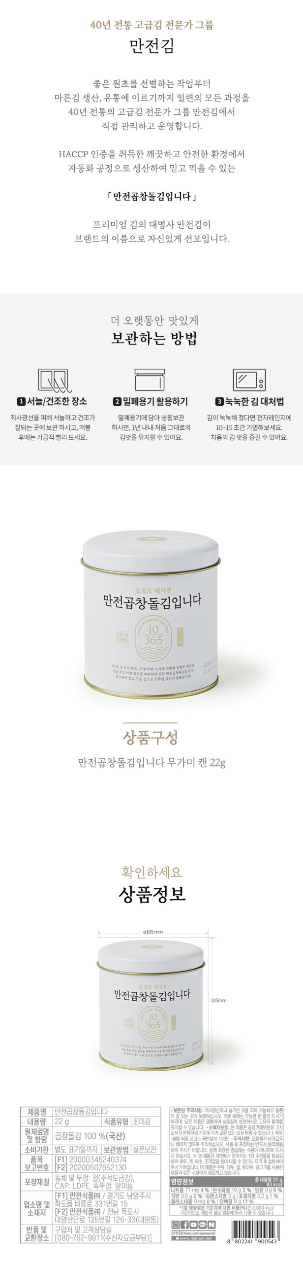 Unlike seasoned seaweed, MANJUN Gopchang Dolkim is roasted without any added seasoning. This allows you to enjoy the natural umami and subtle sweetness of gopchang seaweed, along with its chewy and crispy texture.