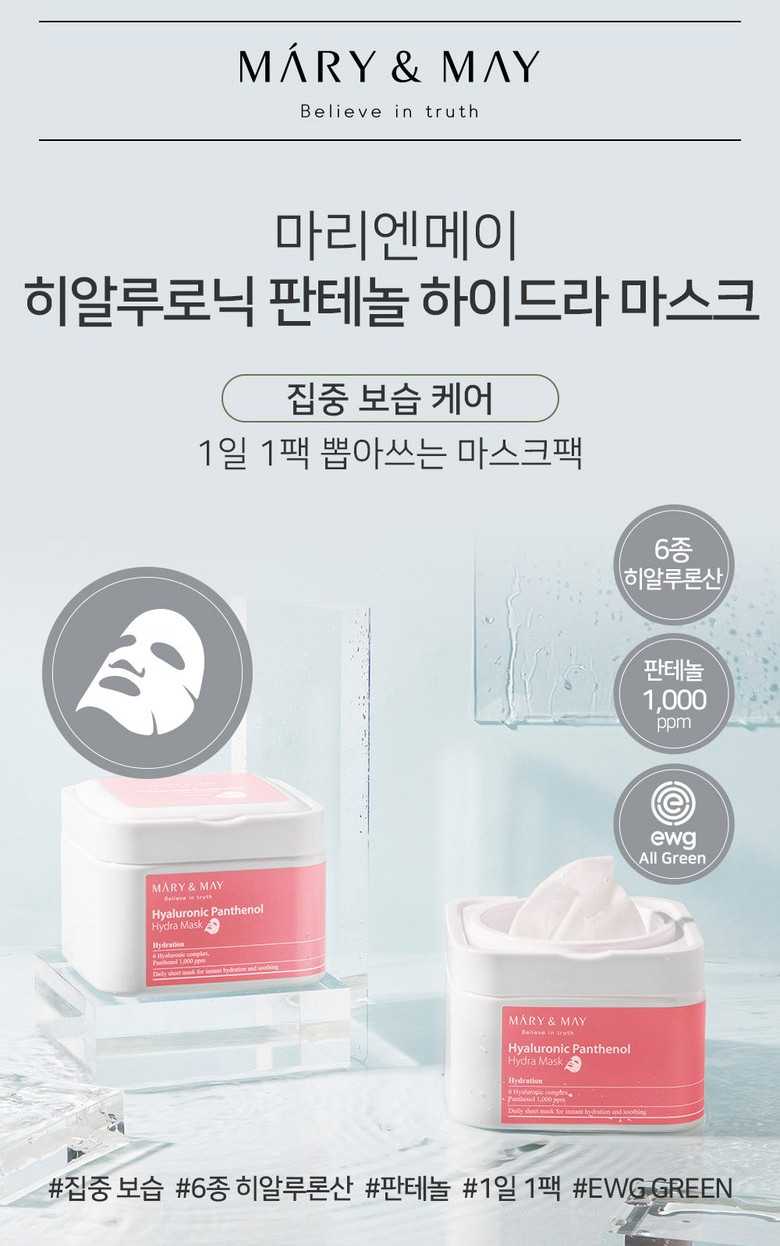 The Mary & May Hyaluronic Panthenol Hydra Mask intensively hydrates dry and rough skin to make skin smooth and clear. Hyaluronic Acid, an excellent moisture supply source that holds water 1000 times its body weight, effectively delivers moisture to the skin, helping to keep the skin soft and moist. Panthenol is converted into Vitamin B5 when absorbed by the skin, and are effective in moisture retention, moisturisation, and skin calming, making dry and rough skin smooth. This mask also contains natural-derived Allantoin, which helps heal skin wounds and protects sensitive skin. Contained in a large-capacity case, easily pull out one sheet each day, which helps reduce unnecessary waste!