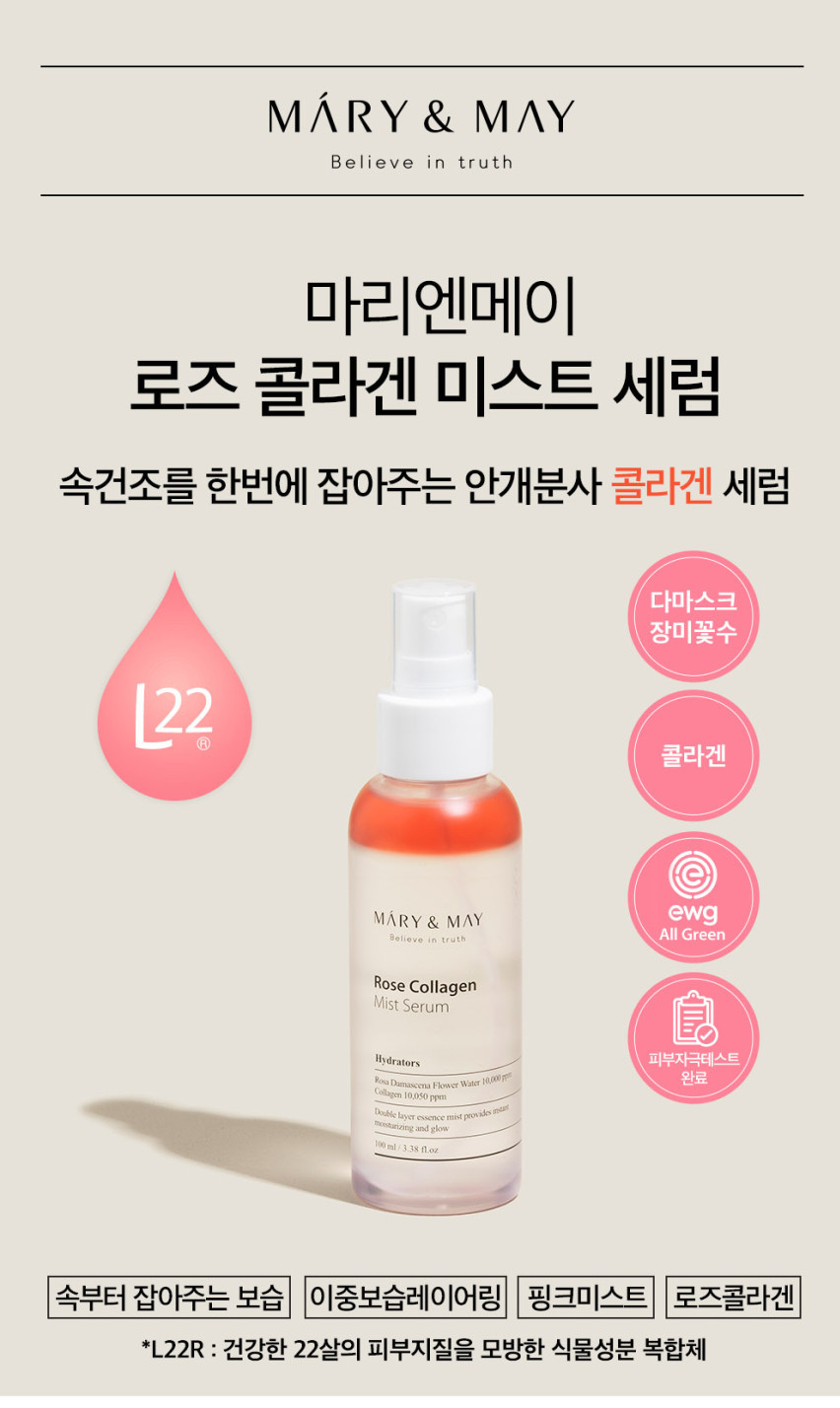 The Mary & May Rose Collagen Mist Serum is a dual-layered mist serum enriched with Rosa Damascena Flower Water and Collagen to moisturise skin from the inside out and enhance skin elasticity, leaving healthy and radiant complexion. Composed of a moisture layer that is absorbed into the skin (Damask rose water, collagen, hyaluronic acid), and an oil layer rich in antioxidants (jojoba oil, avocado oil, squalene) similar to our skin lipids to boost elasticity and skin radiance.