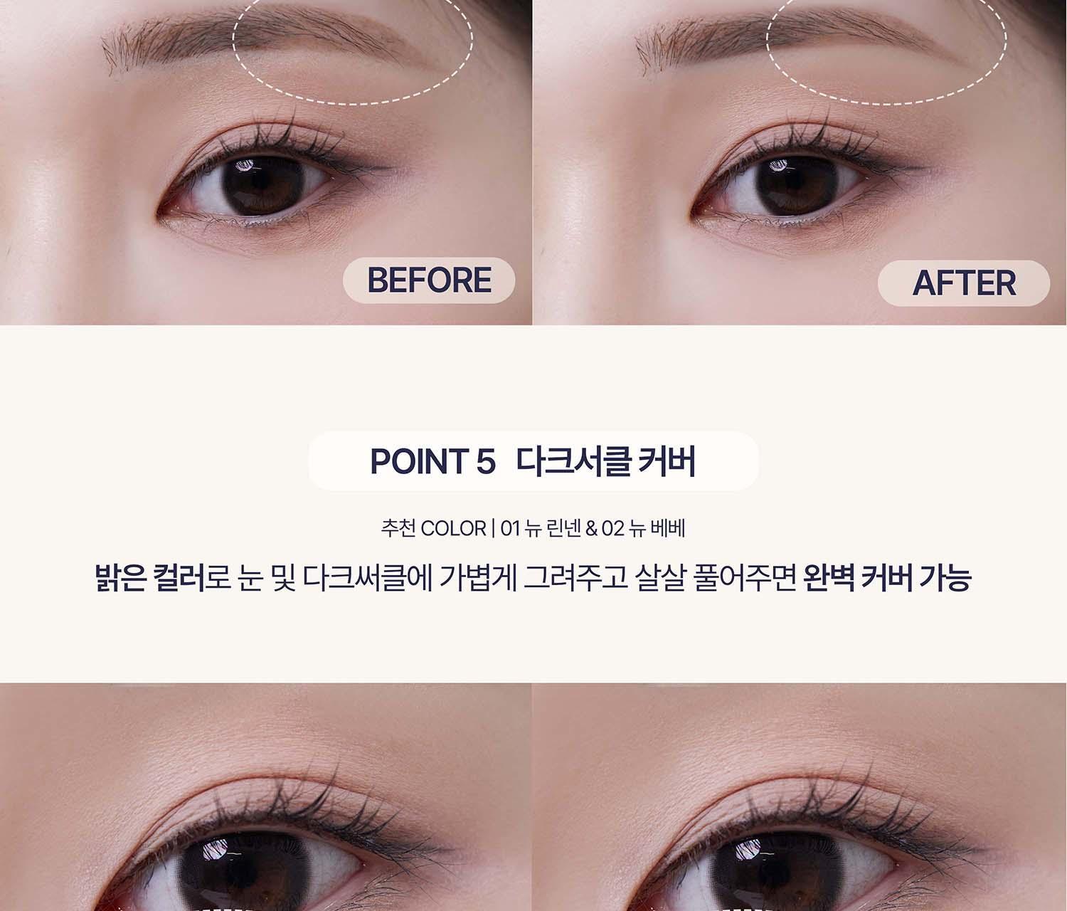 - Lightly draw and blend the bright shade on dark circles to create a refreshed, bright-eyed appearance.