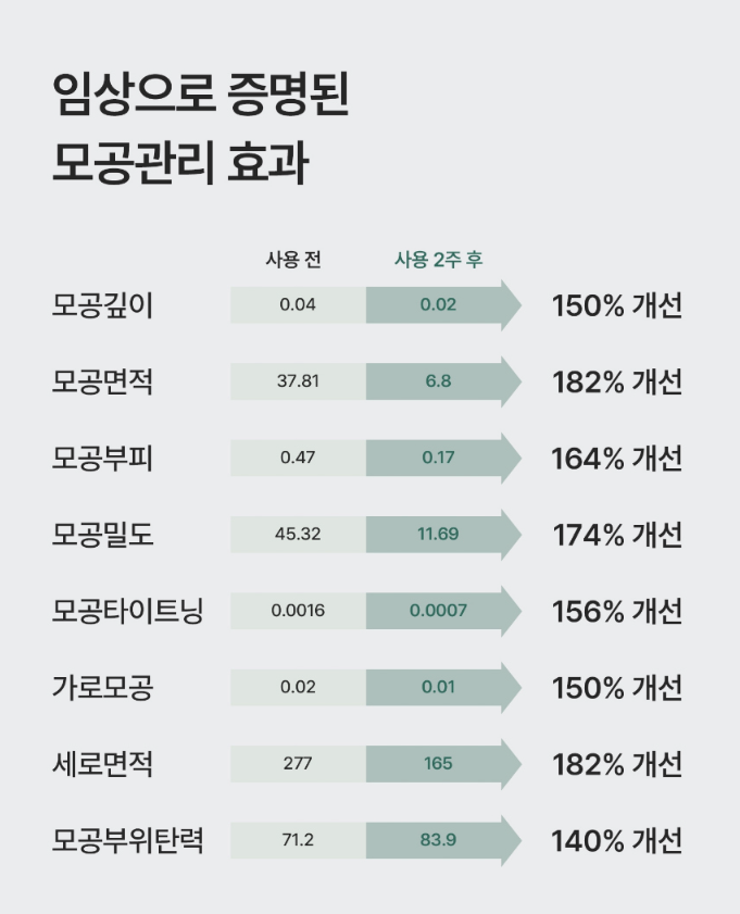 Clinically tested to improve pore depth, area, volume, density, elasticity, and tightening.