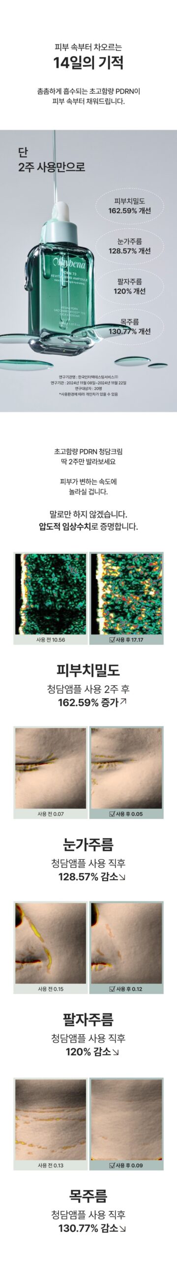 Experience a 120% reduction in smile line wrinkles and a 162.59% increase in skin density with just two weeks of use. The key to youthful skin lies in deep skin density management, and PDRN 73 Ampoule delivers powerful anti-aging benefits by filling and strengthening the skin from within.