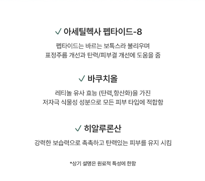 - Acetyl Hexapeptide-8: Improves expression wrinkles and enhances skin elasticity.