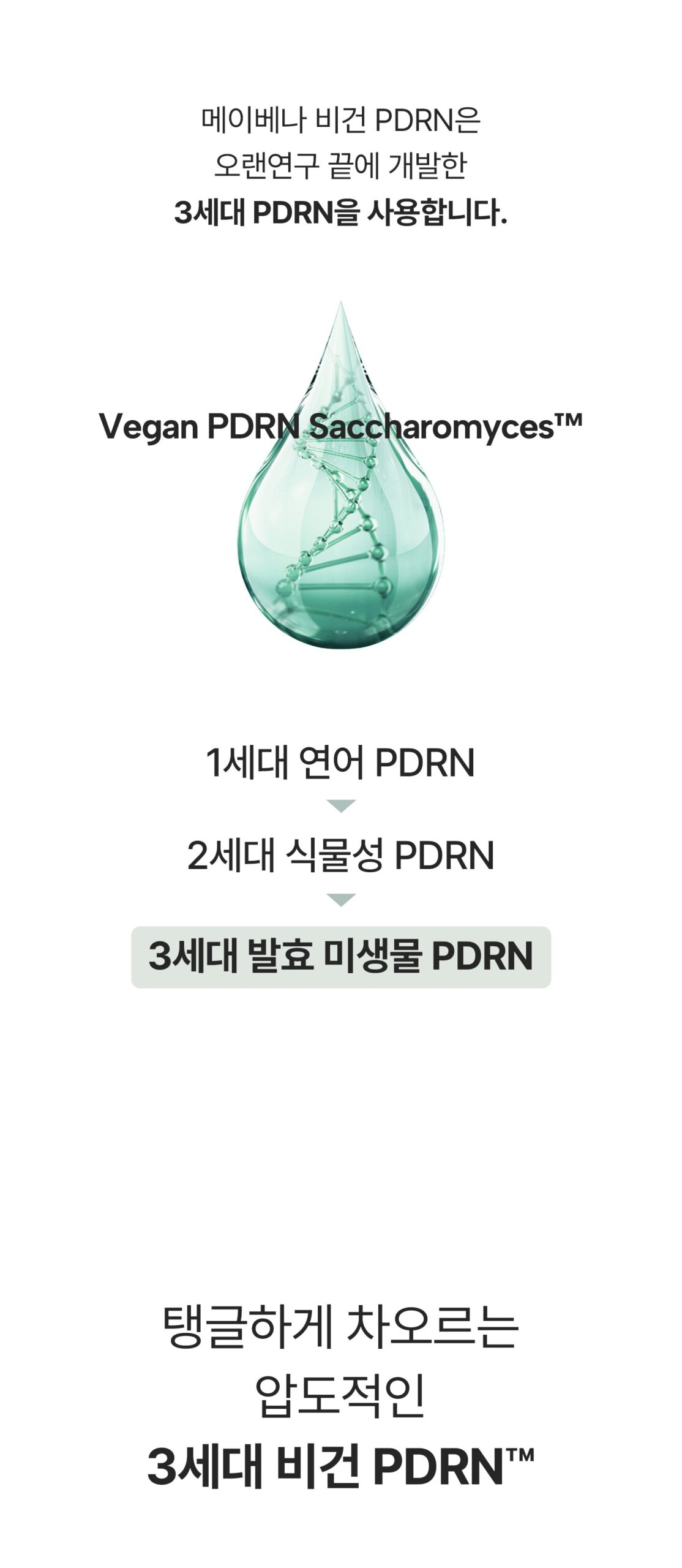 - Advanced 3rd Generation PDRN: Derived from fermented microorganisms, this next-level PDRN is superior to both salmon-based PDRN and plant-derived PDRN.
