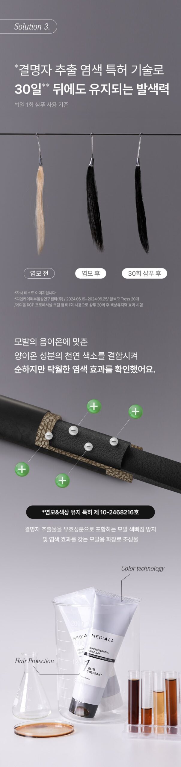 Utilizing patented cassia seed extract technology (Patent No. 10-2468216), MED:ALL ensures vibrant color retention for up to 30 days, even with daily shampoo use. The formula’s natural ion-based colorants deliver gentle yet long-lasting results. -