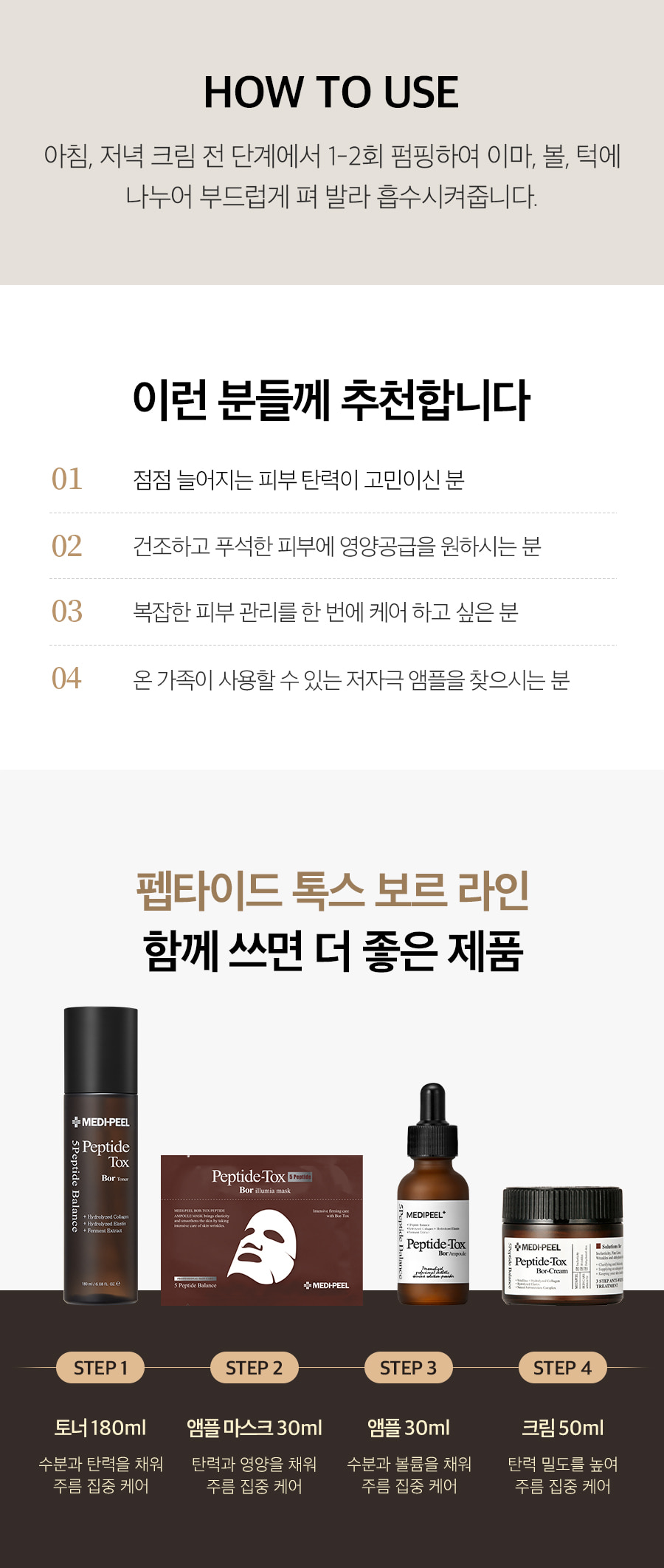 | STEP 1 | Peptide-Tox Bor Toner | 180ml | Fills moisture & elasticity, intensive wrinkle care |
