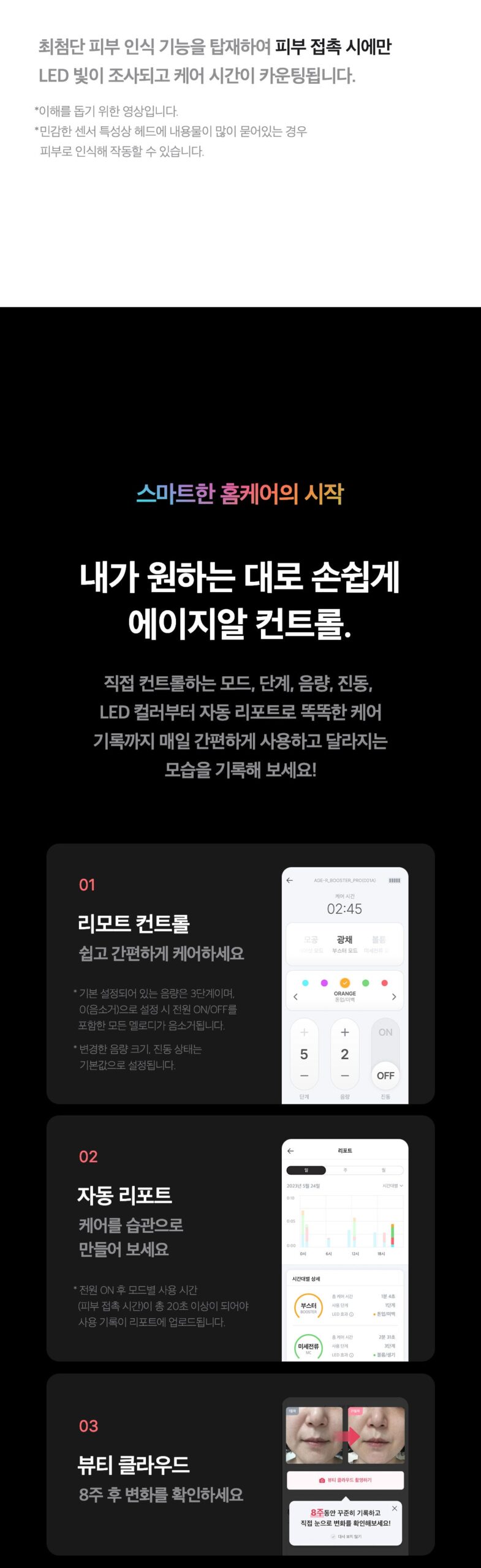 - Smart Control and Reporting: Easily control modes, steps, volume, vibration, and LED colors through the AGER app. Automatic reports track your skincare progress over time.