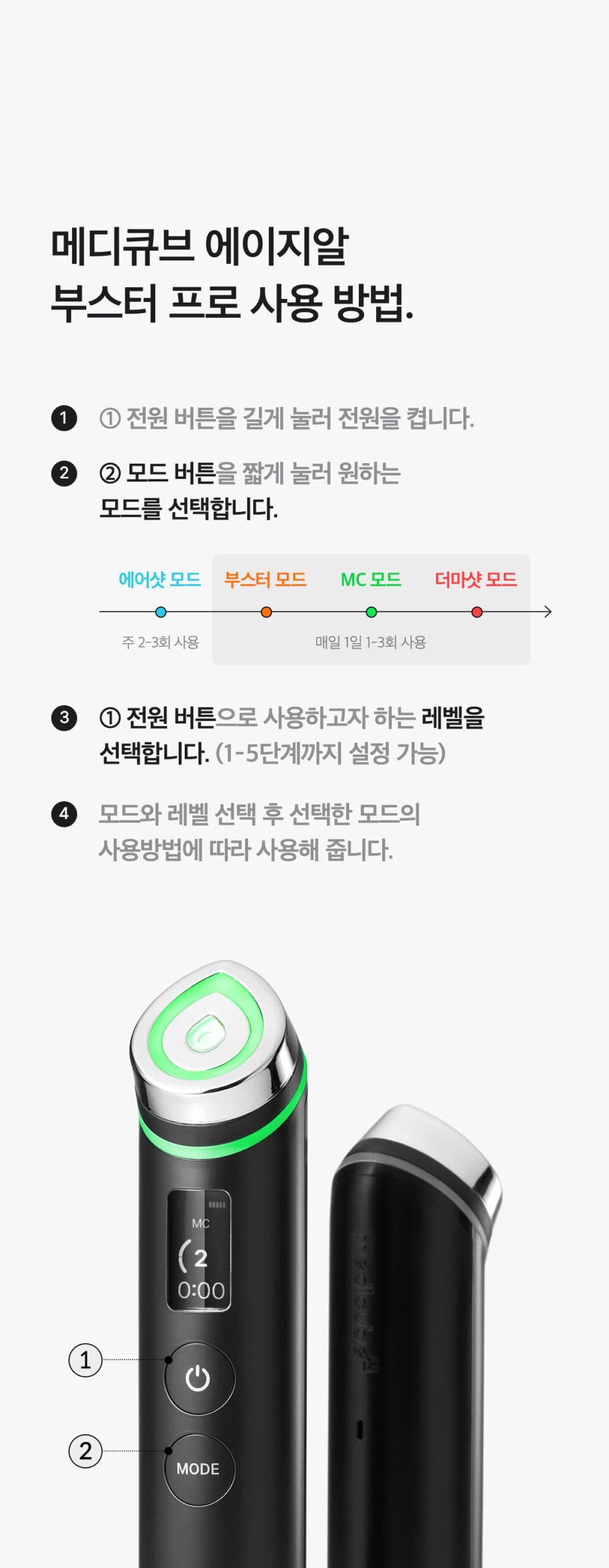 - Select Mode: Briefly press the mode button to choose from Booster, Microcurrent, Derma Shot, or Air Shot modes.