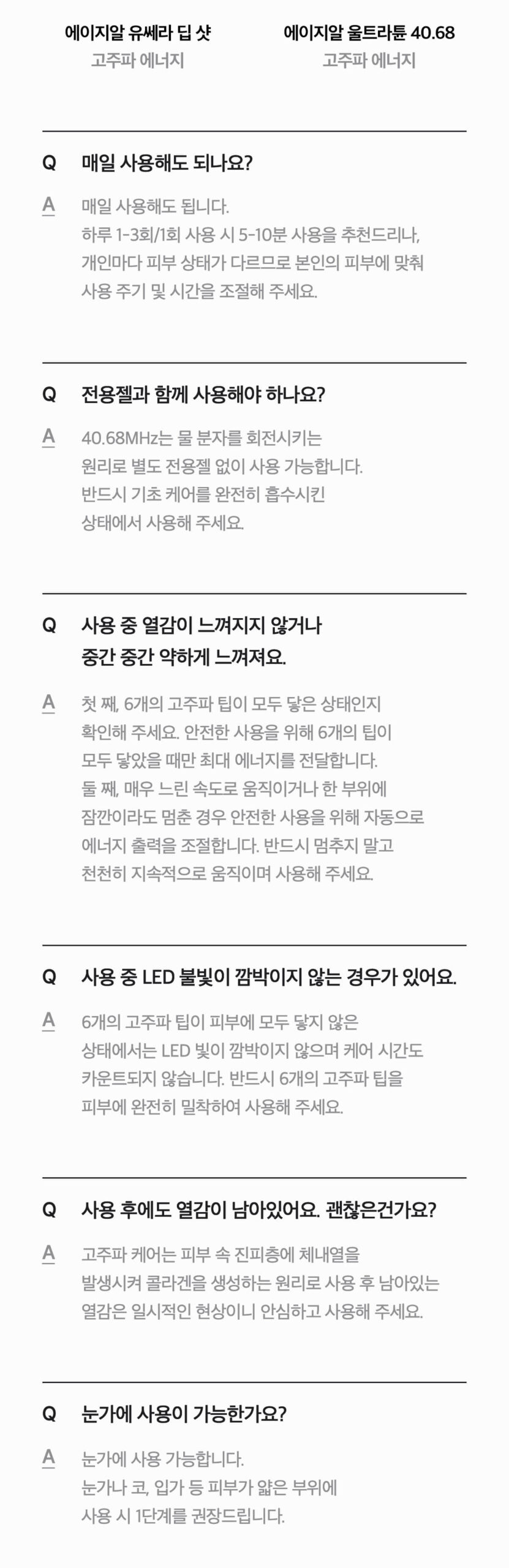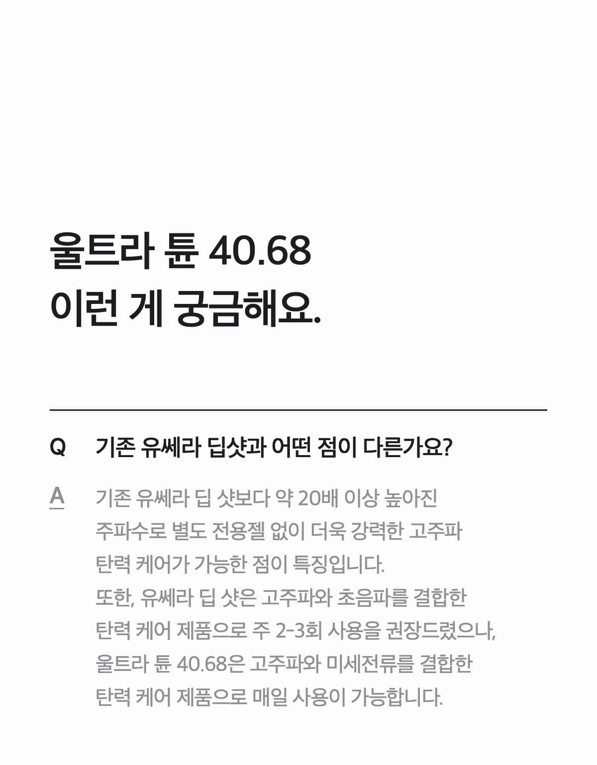 A: Ultra Tune 40.68 boasts a frequency over 20 times higher than USSERA Deep Shot, allowing for stronger high-frequency skin tightening care without the need for a dedicated gel. USSERA Deep Shot combined high-frequency and ultrasound technology and recommended 2-3 times weekly use, while Ultra Tune 40.68 pairs high-frequency with microcurrent technology and can be used daily.