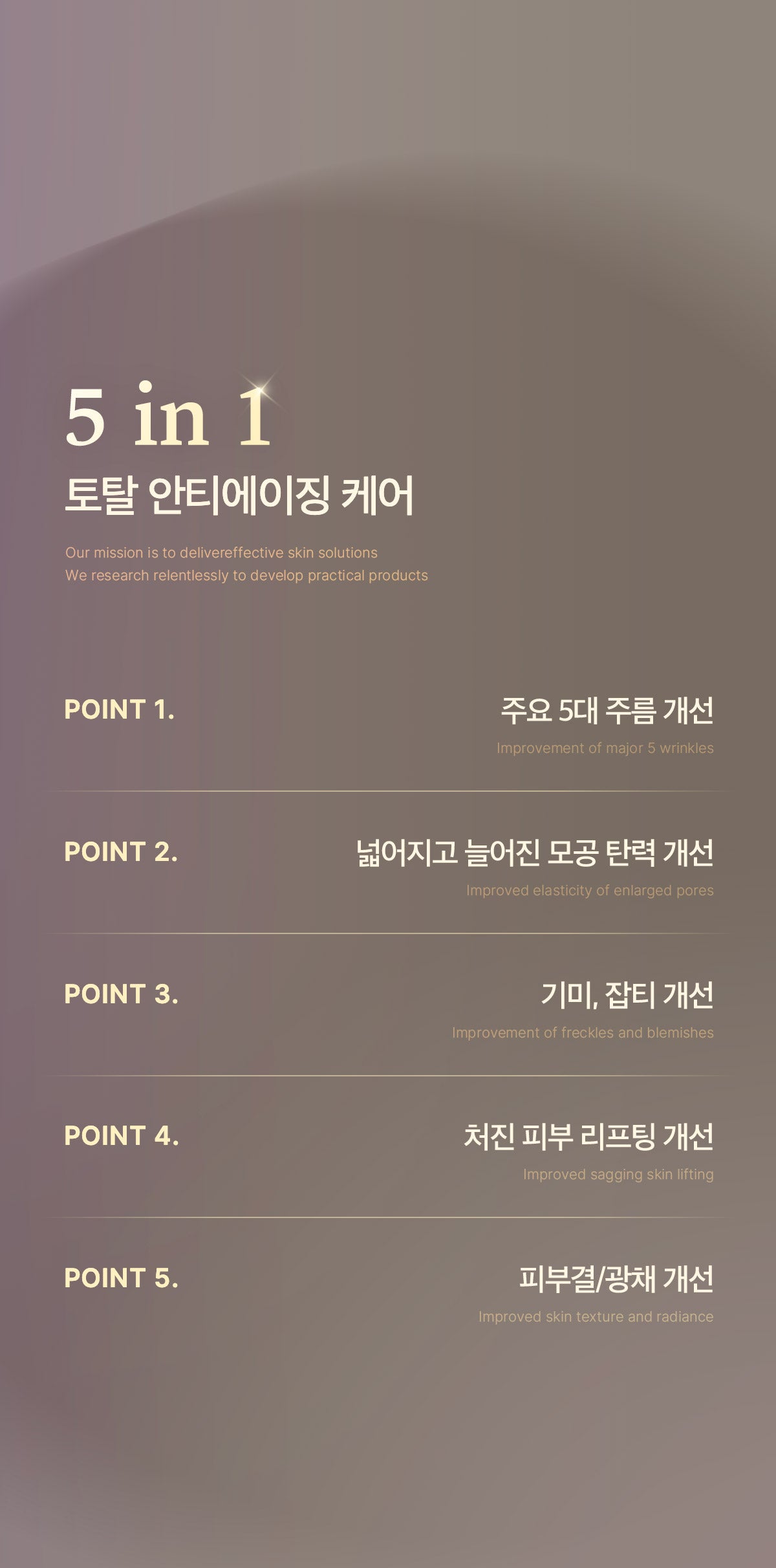Achieve dramatic anti-aging effects, including wrinkle reduction, pore minimization, and improvements in skin texture and radiance, validated by 25 human application tests. Its watery formulation ensures rapid absorption, providing 5-in-1 total anti-aging care for comprehensive improvements in skin health.