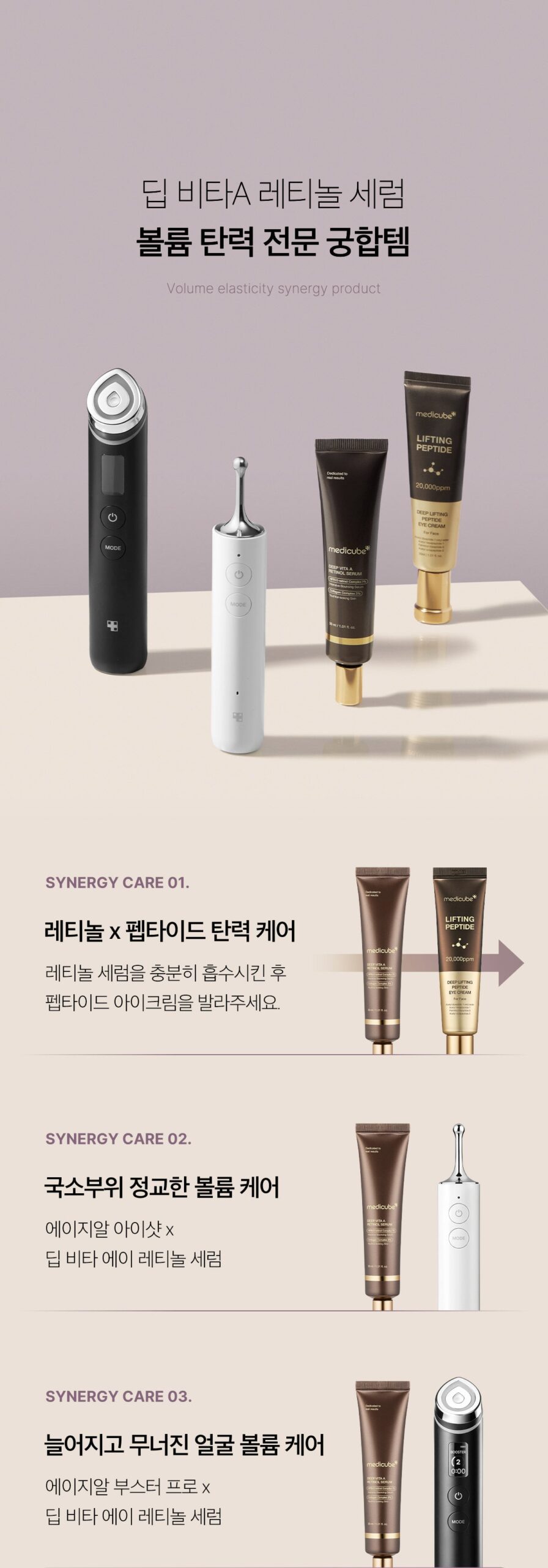Maximize your skincare routine with Medicube’s synergy care products, including the AGER Eye Shot and AGER Booster ProX Deep Vita A Retinol Serum, for an astounding 785% increase in elasticity when used in conjunction.