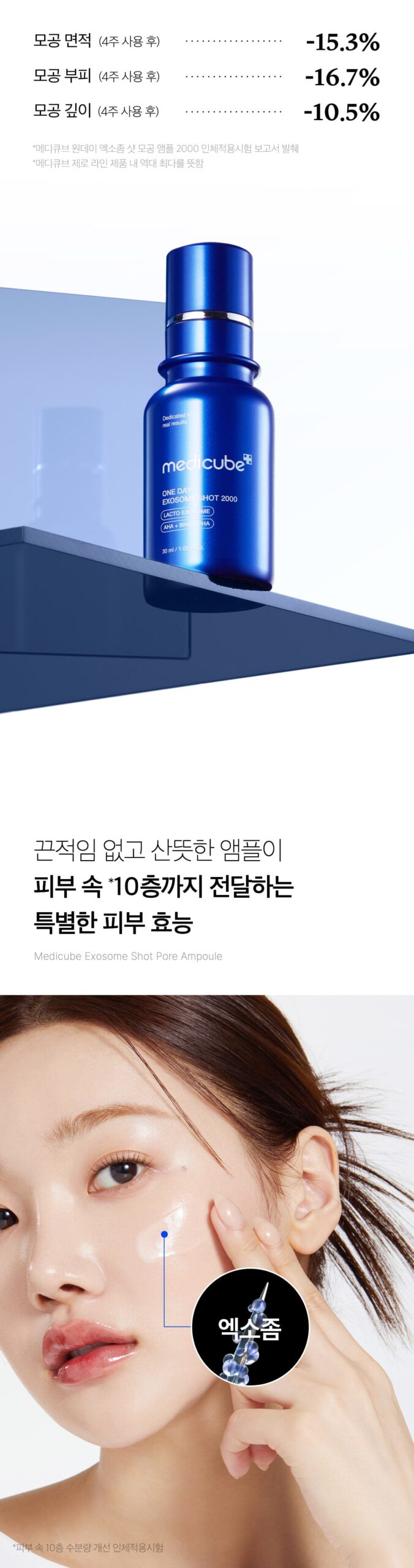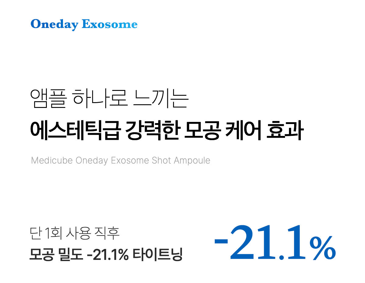 Designed to deliver a precise, sharp shot of exosomes deep into the pores, Medicube’s One Day Exosome Shot 2000 is engineered for maximum pore tightening effect. By combining exosomes with this unique delivery system, it captures the essence of aesthetic-grade pore tightening, offering: