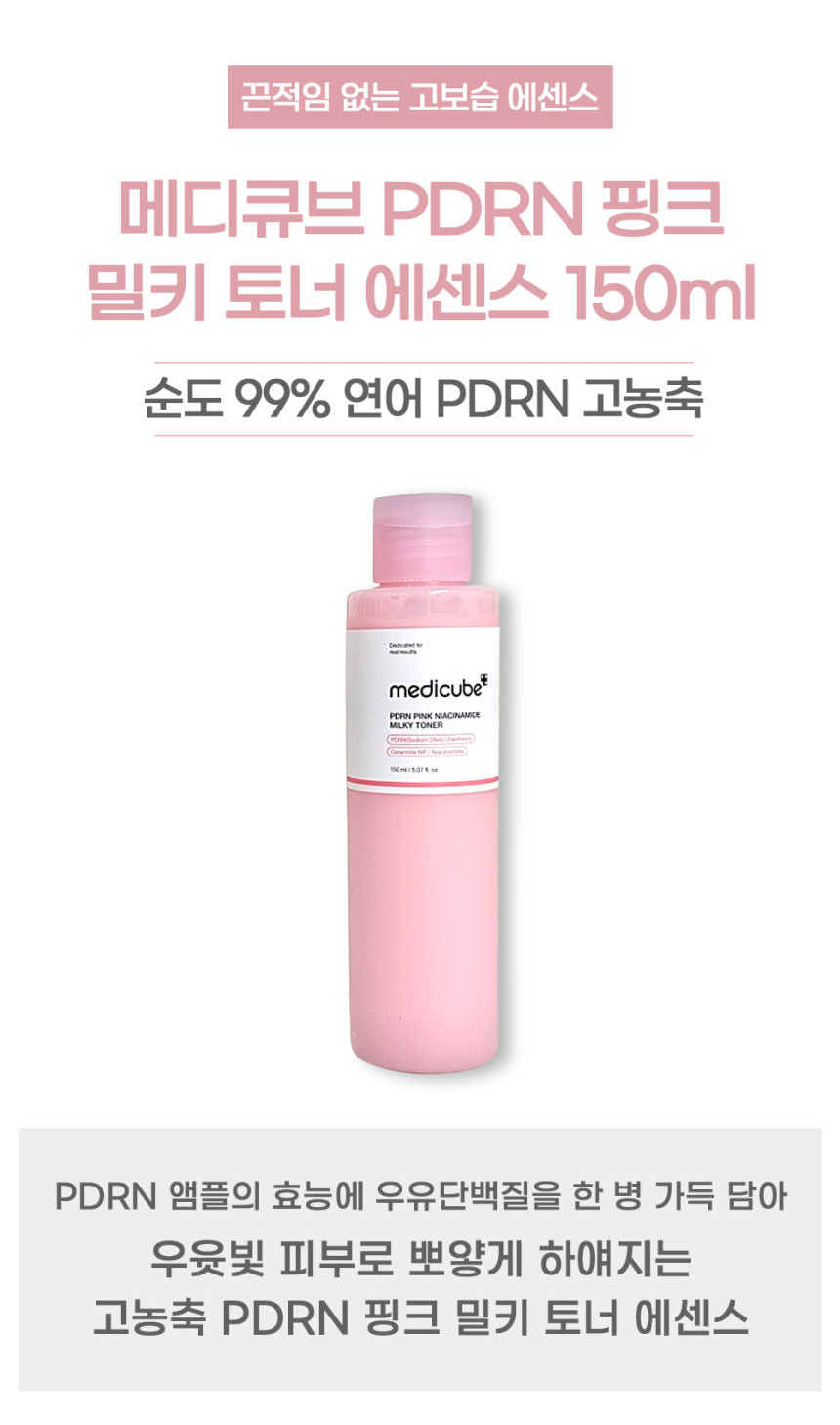 The Medicube PDRN Pink Niacinamide Milky Toner is a pink, milky toner for dewy, glowy and moisturised skin. Features Salmon DNA PDRN, a form of DNA extracted from salmon to stimulate skin renewal and repair, giving your skin a clearer, more luminous complexion. Also contains Ceramide and Peptide to deliver moisture to all skin layers, together with Niacinamide to brighten and even out skin tone. The lightweight milky texture is absorbed quickly to the skin without stickiness or residue.