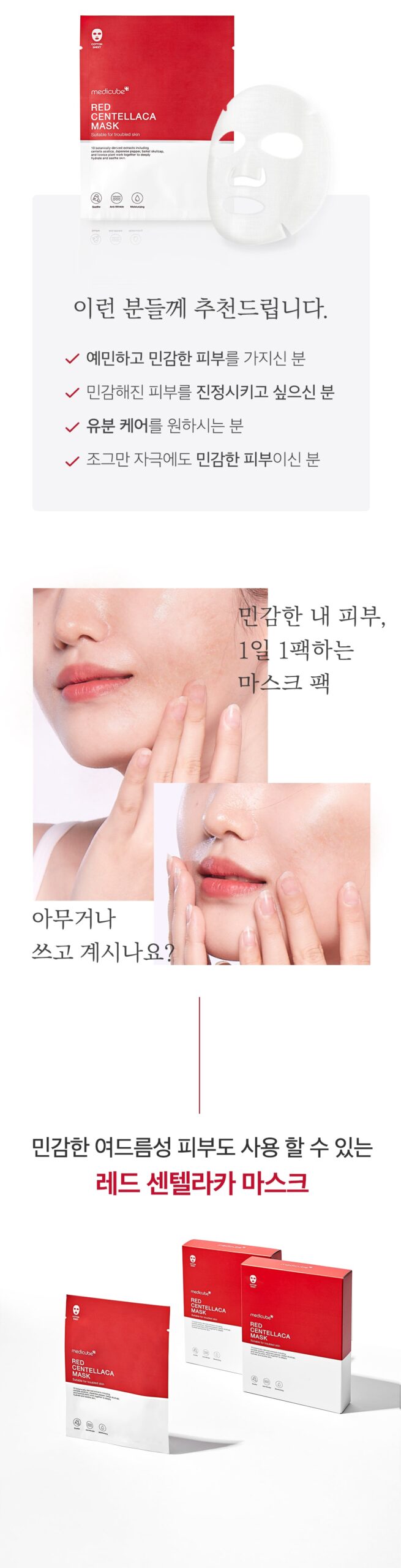 Introducing the Medicube Red Centellaca Mask, a comprehensive skincare solution designed specifically for those with acne-prone skin and skin bumps. This innovative product is part of the Red Line series, offering a three-step process that targets redness, sensitivity, and various skin concerns including large pores, flakiness, and oiliness. Ideal for anyone seeking a thorough and gentle skincare regimen, this 100% cotton mask is a must-have.