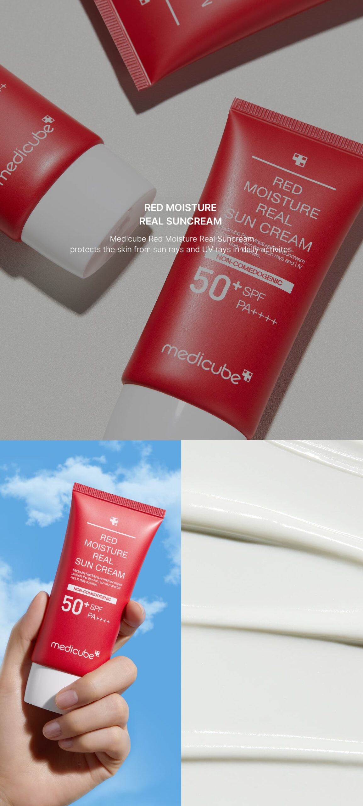 I recently started using the Medicube Red Moisture Real Sun Cream, and I am impressed with its performance. With SPF50+PA++++ protection, it effectively shields my sensitive skin from harmful UV rays without any irritation. The lightweight formula absorbs quickly, leaving no greasy residue behind, which is a huge plus for daily wear. I’ve noticed that my complexion feels more hydrated throughout the day thanks to its moisturizing properties. Additionally, knowing it’s non-comedogenic gives me peace of mind as someone prone to breakouts.