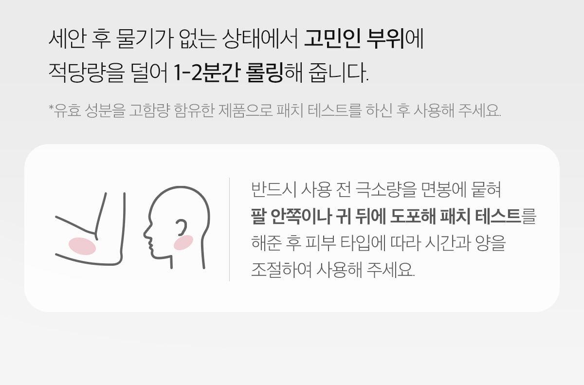 02. Check the level of irritation depending on your skin type, apply for 1 to 2 minutes, and then rinse thoroughly with water.