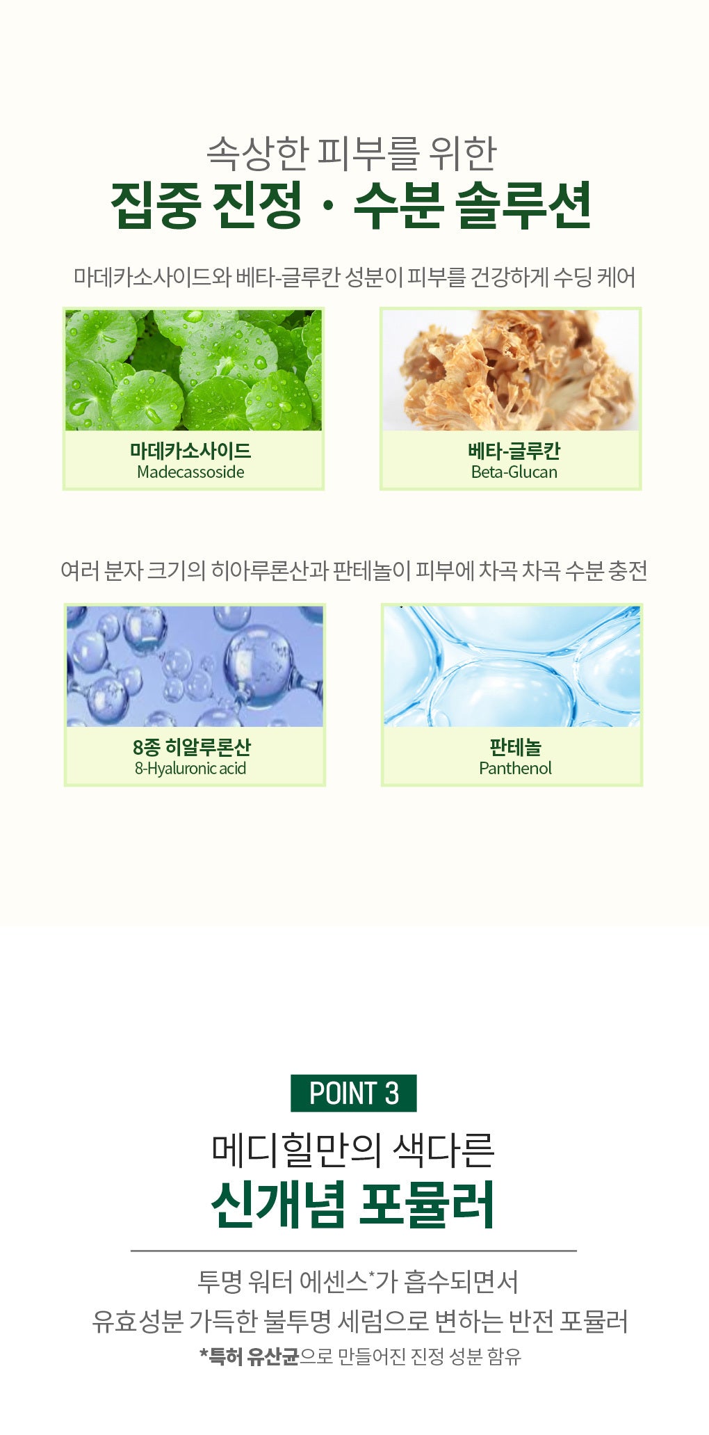 This intensive solution is enriched with madecassoside, beta-glucan, eight types of hyaluronic acid, and panthenol, targeting intense soothing and moisture replenishment.