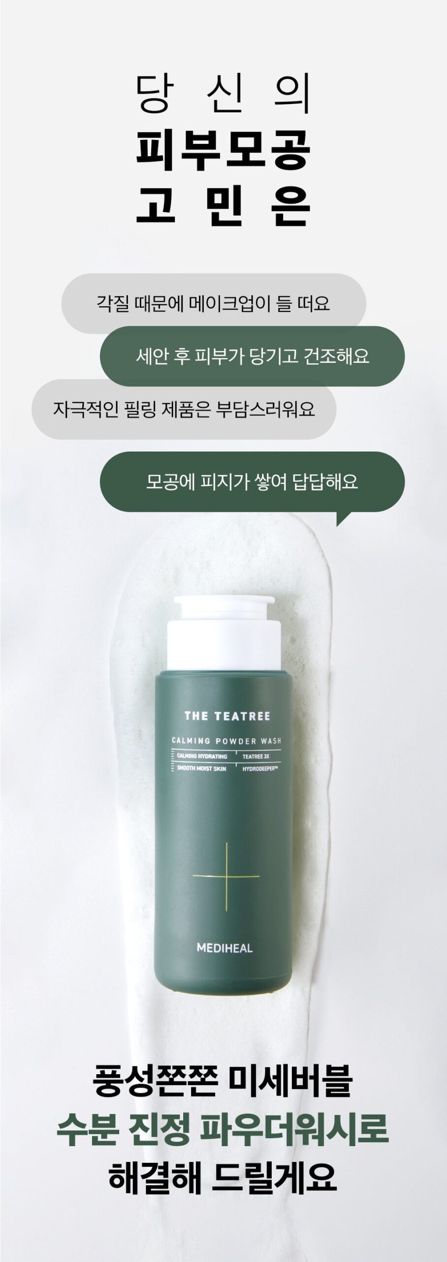 This Teatree Calming Powder Wash is designed to address common skin concerns such as flaky makeup due to dead skin cells, skin tightness and dryness post-wash, burdensome peeling products, and sebum-clogged pores. It offers a moisture-rich solution with soothing properties for effective pore cleansing.