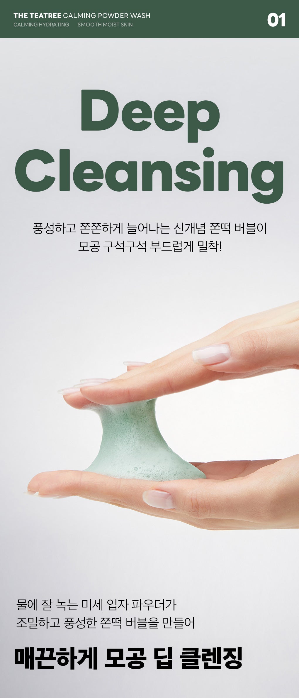 This Teatree Calming Powder Wash is an ideal daily pore cleansing solution, offering a blend of deep cleansing and soothing hydration, leaving the skin feeling clean, smooth, and moisturized without any tightness.