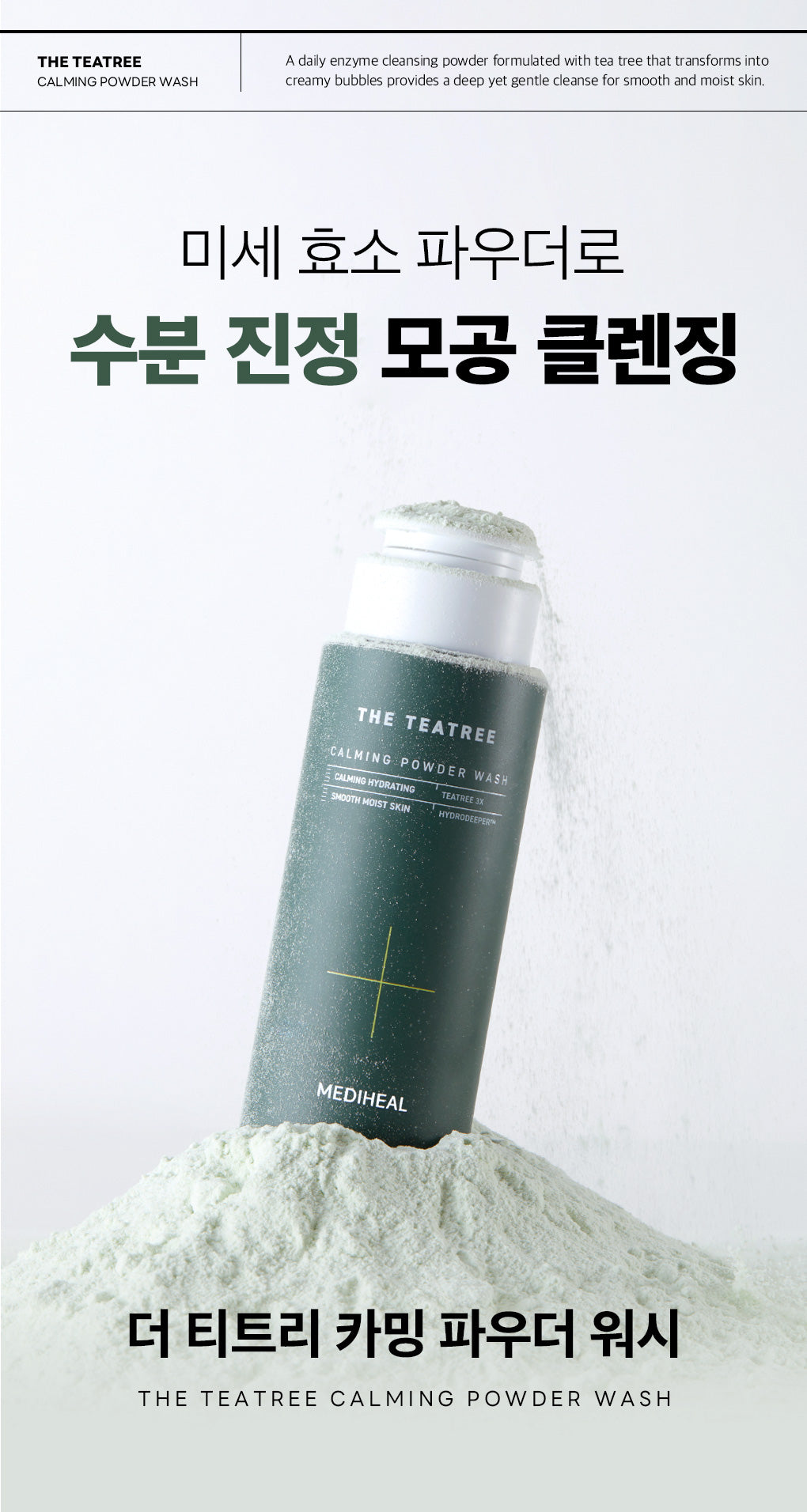This Teatree Calming Powder Wash is an ideal daily pore cleansing solution, offering a blend of deep cleansing and soothing hydration, leaving the skin feeling clean, smooth, and moisturized without any tightness.