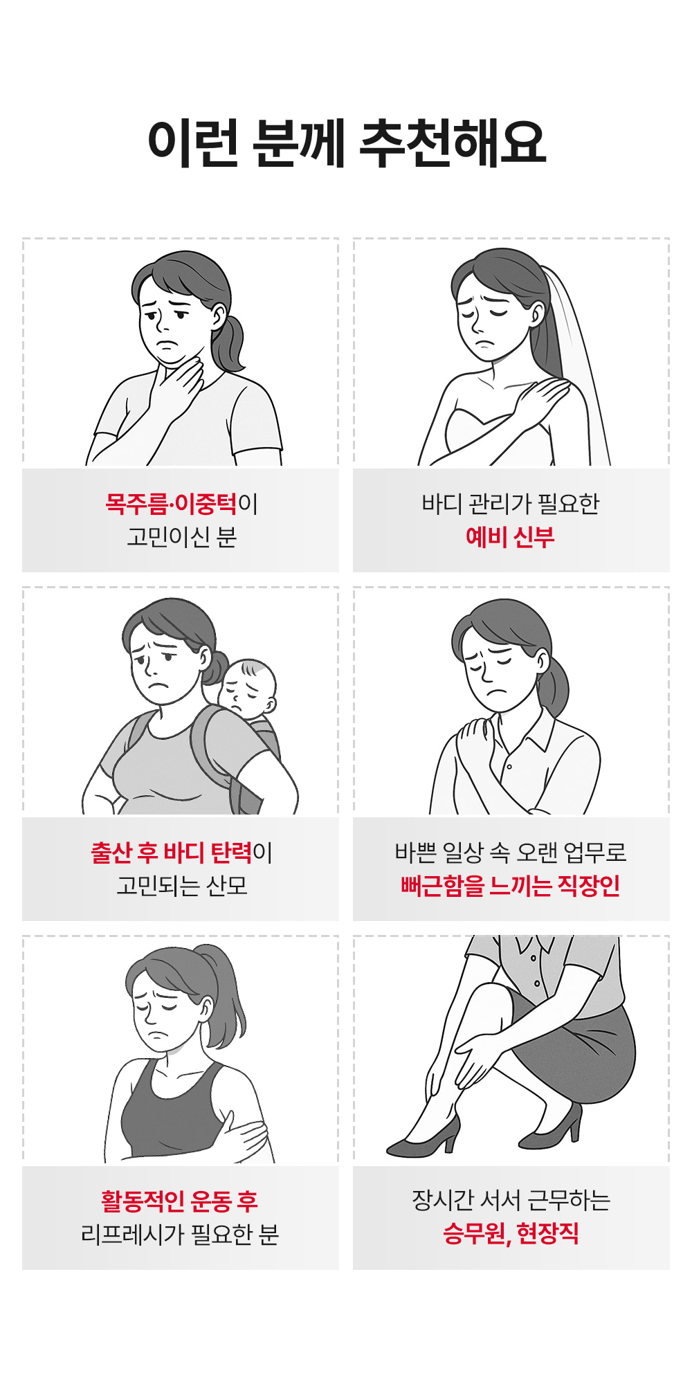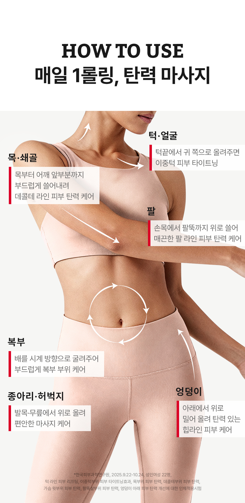 *Clinical trials conducted by Korea Institute of Dermatological Sciences (22 adult women) demonstrated improvement in jawline skin lifting/double chin skin tightening, and skin elasticity in the neck, décolleté, arm fat, upper chest, and under buttocks areas.