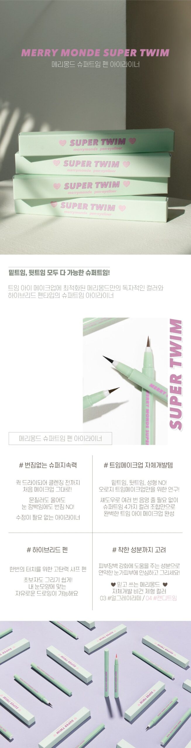 *We inform you that the MERRY MONDE Super Twim Pen Eyeliner should be used after closing the lid and shaking it at least 20 times before use to ensure that the pigments come out stably.