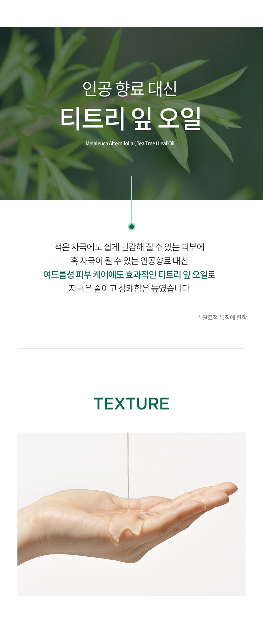 * Instead of artificial fragrances, tea tree leaf oil, which is effective for acne-prone skin care, reduces the amount and refreshes the skin.