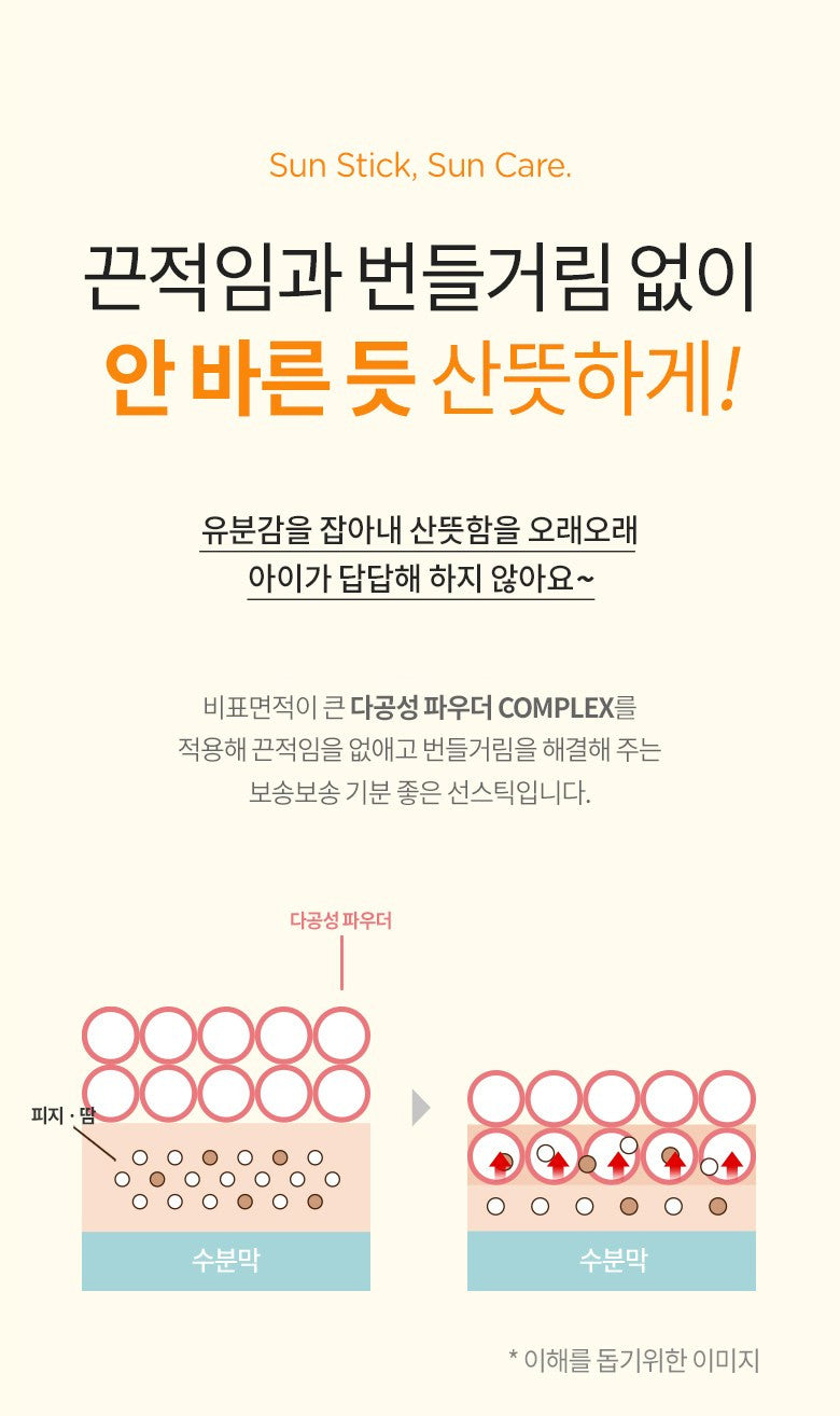 It is a pleasant sunstick that removes stickiness and solves the oilyness by applying porous powder COMPLEX with a large specific surface area.