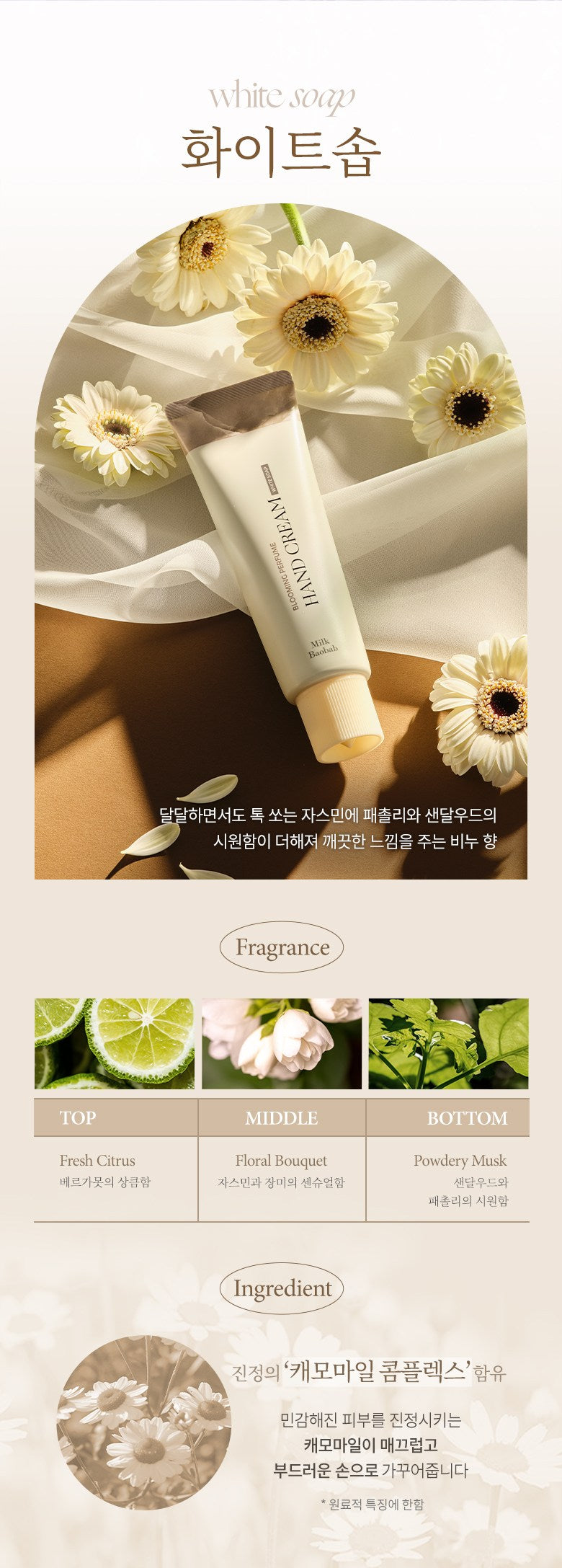 Chamomile, which soothes sensitive skin, makes your hands smooth and soft.