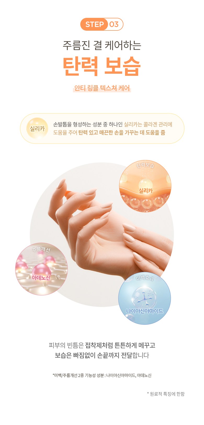 Silica, one of the ingredients that form nails, helps to maintain elastic and smooth hands by helping to manage collagen.