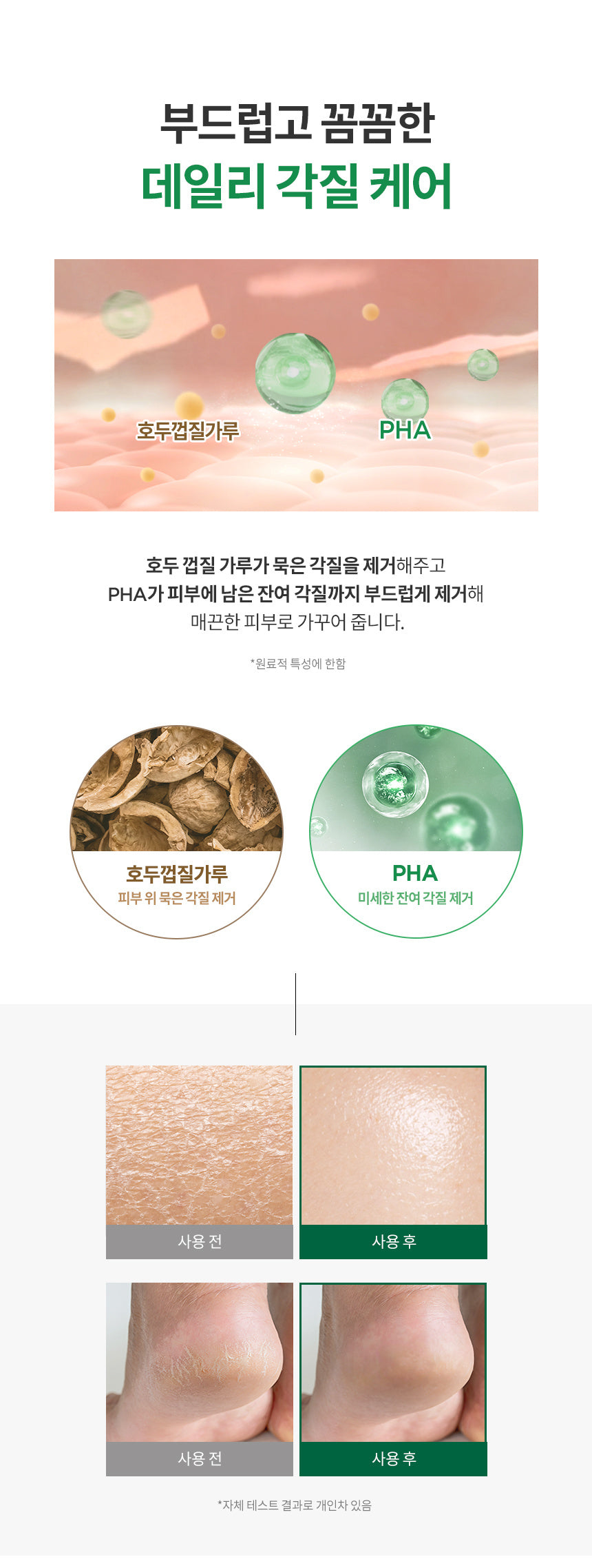 Walnut shell powder removes old dead skin cells, and PHA gently removes the remaining dead skin cells for smooth skin.