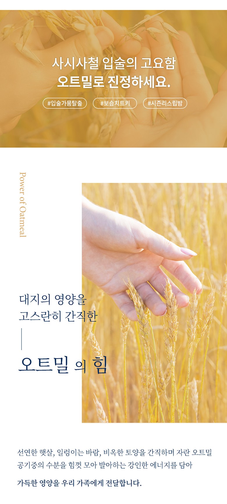 Soothe your lips all year round with the incredible strength of Oatmeal. Grown under bright sunshine, swaying winds, and fertile soil, oatmeal naturally gathers moisture from the air and sprouts, embodying a powerful energy. We harness this natural vitality to deliver rich nutrition to your family’s lips.