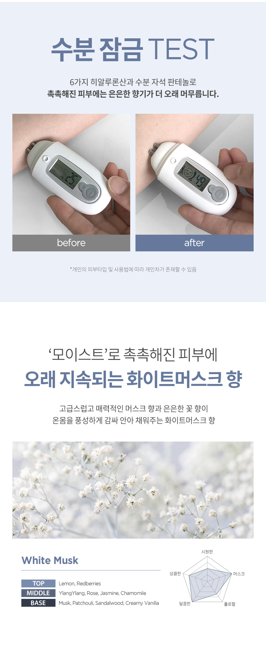 The luxurious and attractive musk scent and the delicate floral scent of white musk envelops and fills the whole body.