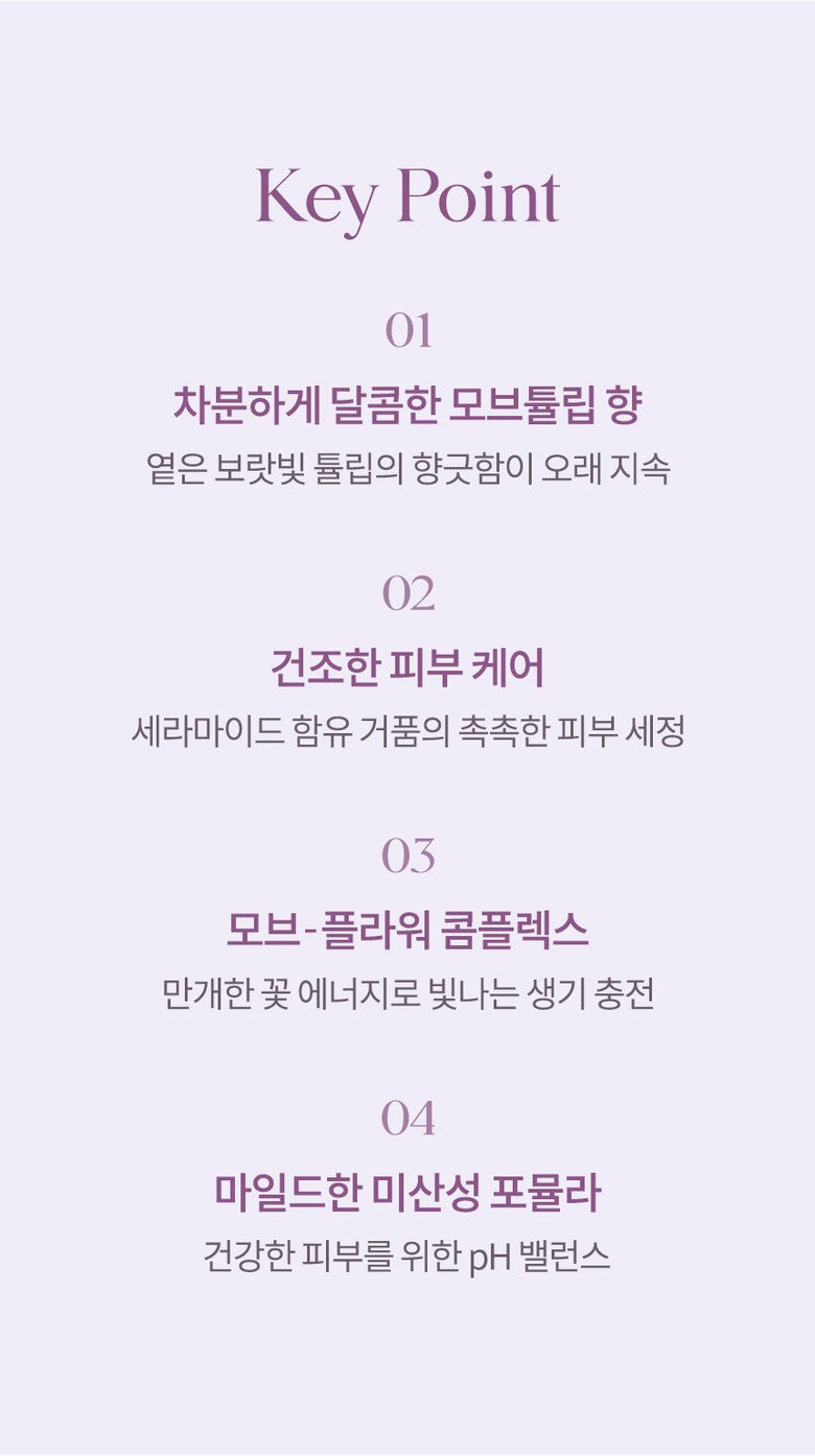 Enjoy a soothing and sweet mauve tulip fragrance that lingers subtly on your skin, enhancing your cleansing routine with a touch of elegance. -