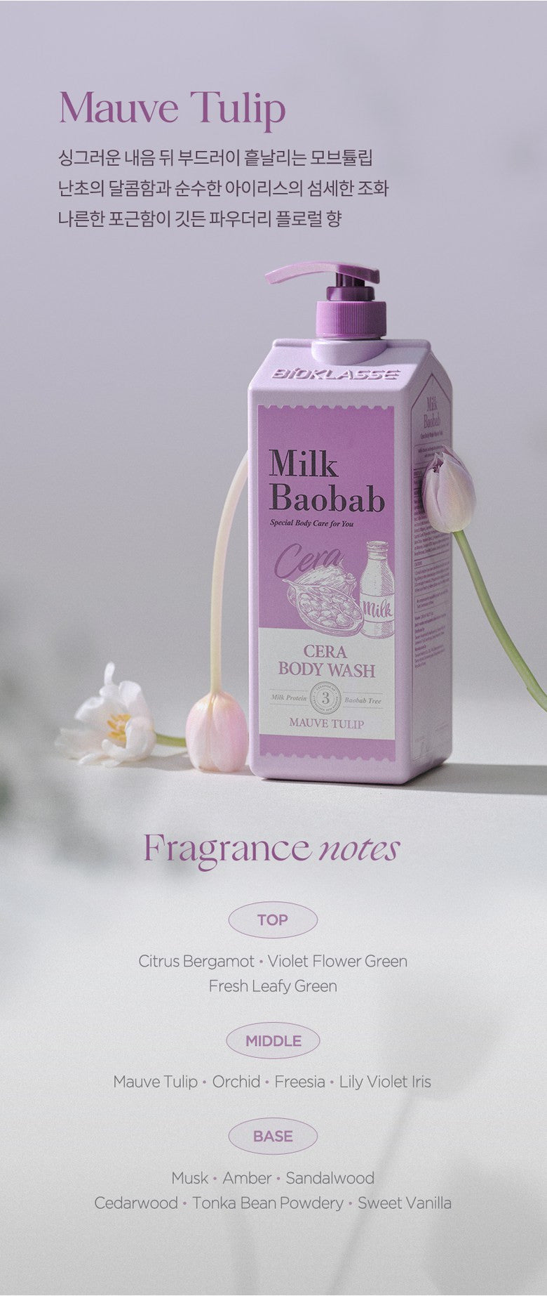 Enjoy a soothing and sweet mauve tulip fragrance that lingers subtly on your skin, enhancing your cleansing routine with a touch of elegance. -