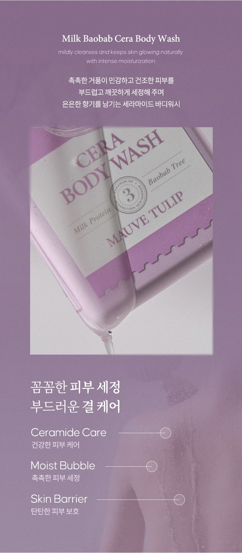This body wash is enriched with a unique blend of mauve flower extracts, known for their gentle yet effective benefits in skin care. -