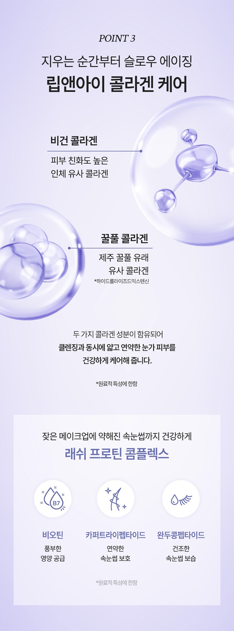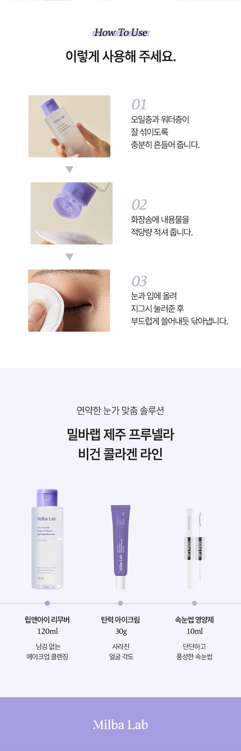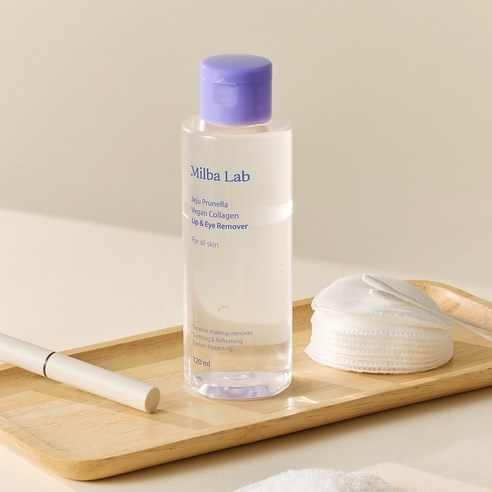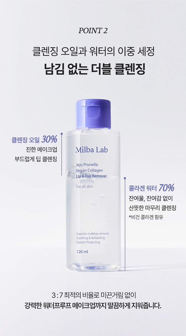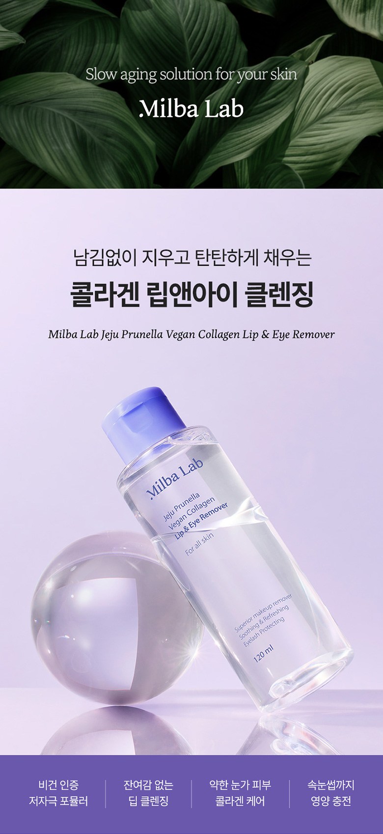 Milba Lab Jeju Prunella Vegan Collagen Lip and Eye Remover is a gentle, dual-phase makeup remover specifically formulated for the delicate lip and eye areas. Featuring vegan collagen from Prunella and Jeju botanical extracts, this remover effectively dissolves waterproof makeup while nourishing the skin. The oil-water formula separates for powerful yet gentle cleansing.