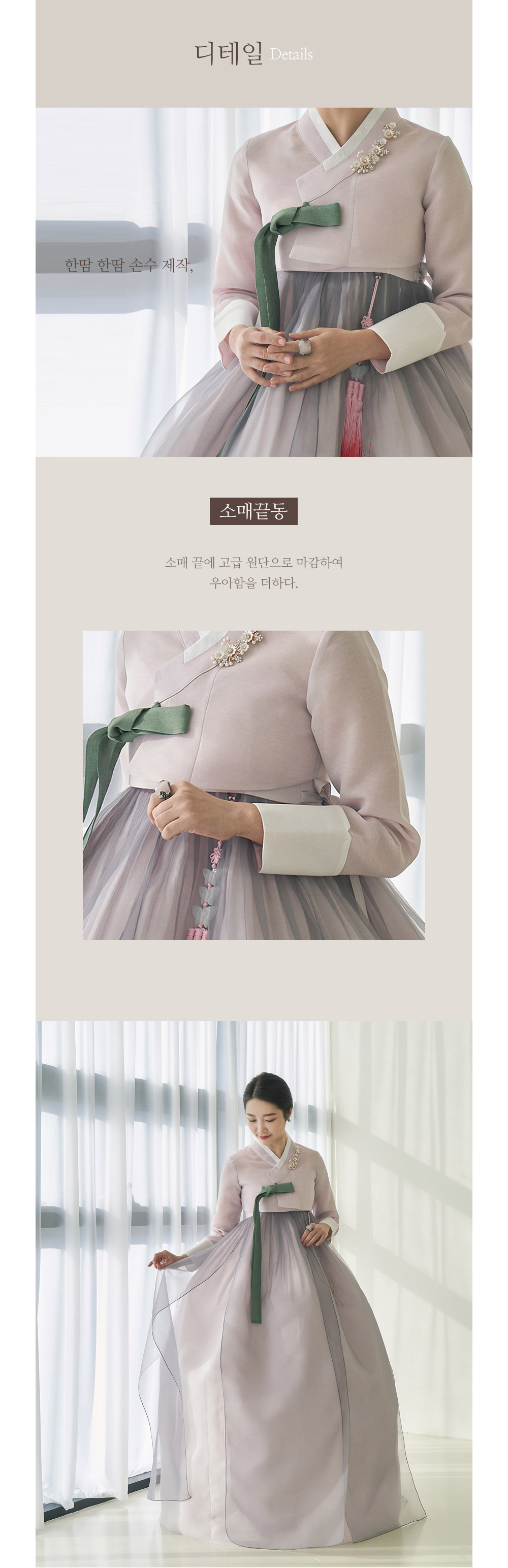 This hanbok is crafted using traditional “keakki” stitching, which enhances the natural texture of the delicate fabric. The lightweight material flows beautifully, offering a soft and luxurious feel.