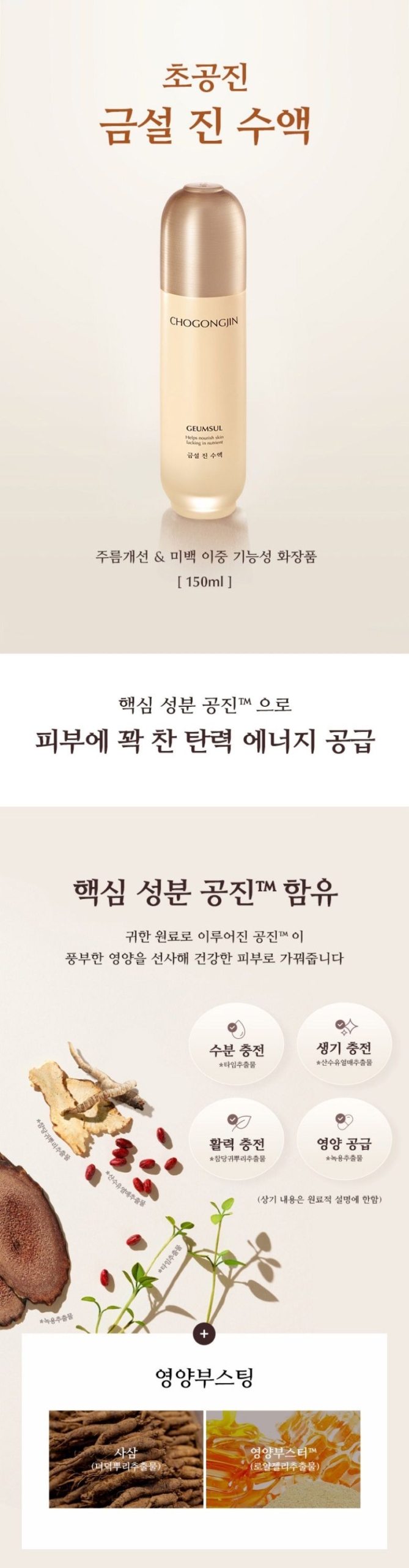 A luxurious nourishing toner from the premium Chogongjin Geumsul line that deeply drenches skin while softly refining skin texture. Formulated with the signature Gongjin™ complex inspired by traditional Korean medicine (Donguibogam), this toner delivers intense nutrition and firming benefits.