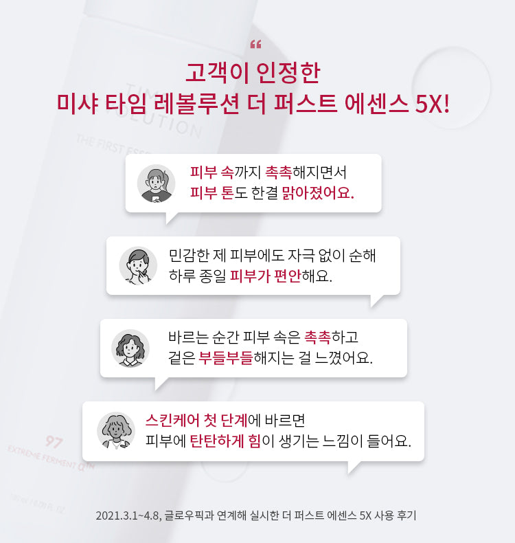 By combining MISSHA’s exclusive extreme fermentation method and special Delivery Technology that helps more dense absorption, MISSHA’s original fermentation absorption technology has come out to the world to stably deliver active ingredients to the skin with excellent skin-friendly property.