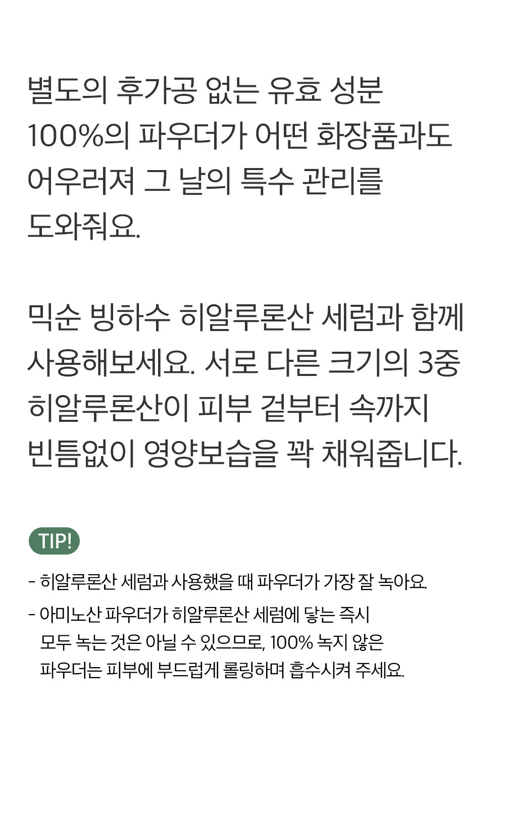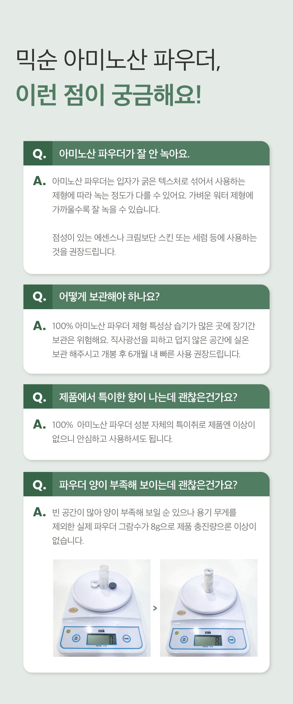- For optimal dissolution, combine with a hyaluronic acid serum. Should any amino acid powder remain undissolved, gently massage it onto your skin until fully absorbed.