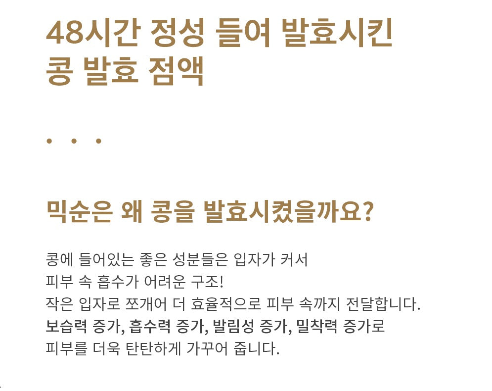The good ingredients in soybeans have large particles and are difficult to absorb into the skin! It is broken down into fine particles and delivered to the skin more efficiently. It makes the skin firmer by increasing moisturizing power, increasing absorption, increasing spreadability, and increasing adhesion.