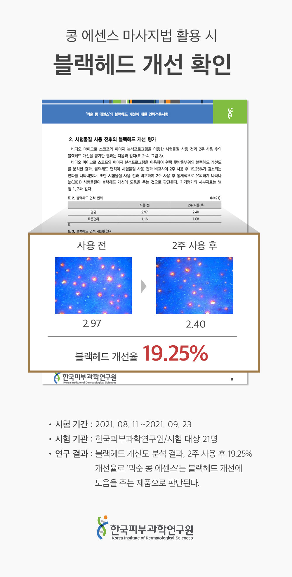 Research Result: As a result of the blackhead improvement analysis, after 2 weeks of use, ‘Mixun Soybean Essence’ is judged to be a product that helps improve blackheads with an improvement rate of 19.25%.
