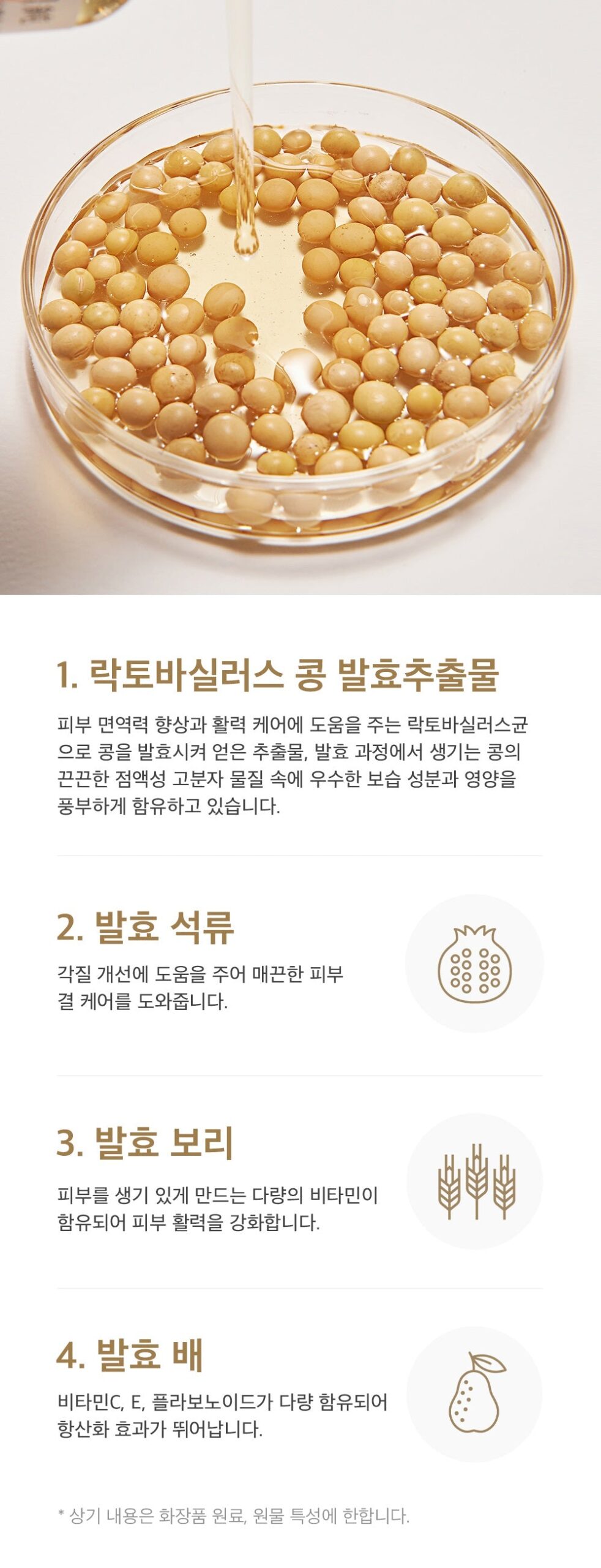 It contains a lot of excellent moisturizing ingredients and nutrients in the extract obtained by fermenting soybeans with Lactobacillus bacteria that helps improve skin immunity and vitality care, and the sticky mucinous polymer of soybeans generated during the fermentation process.