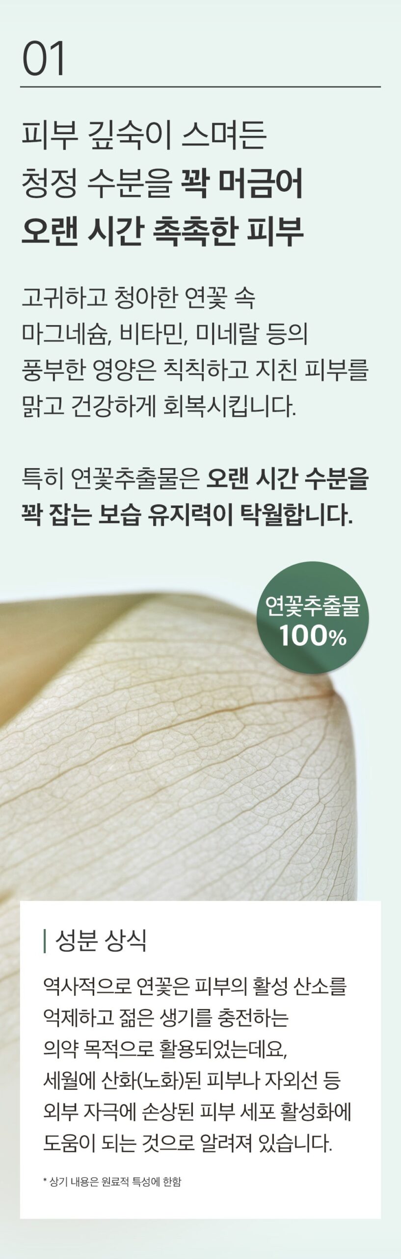 Lotus root extract excels in maintaining skin hydration for extended periods, ensuring a consistently moisturized complexion.