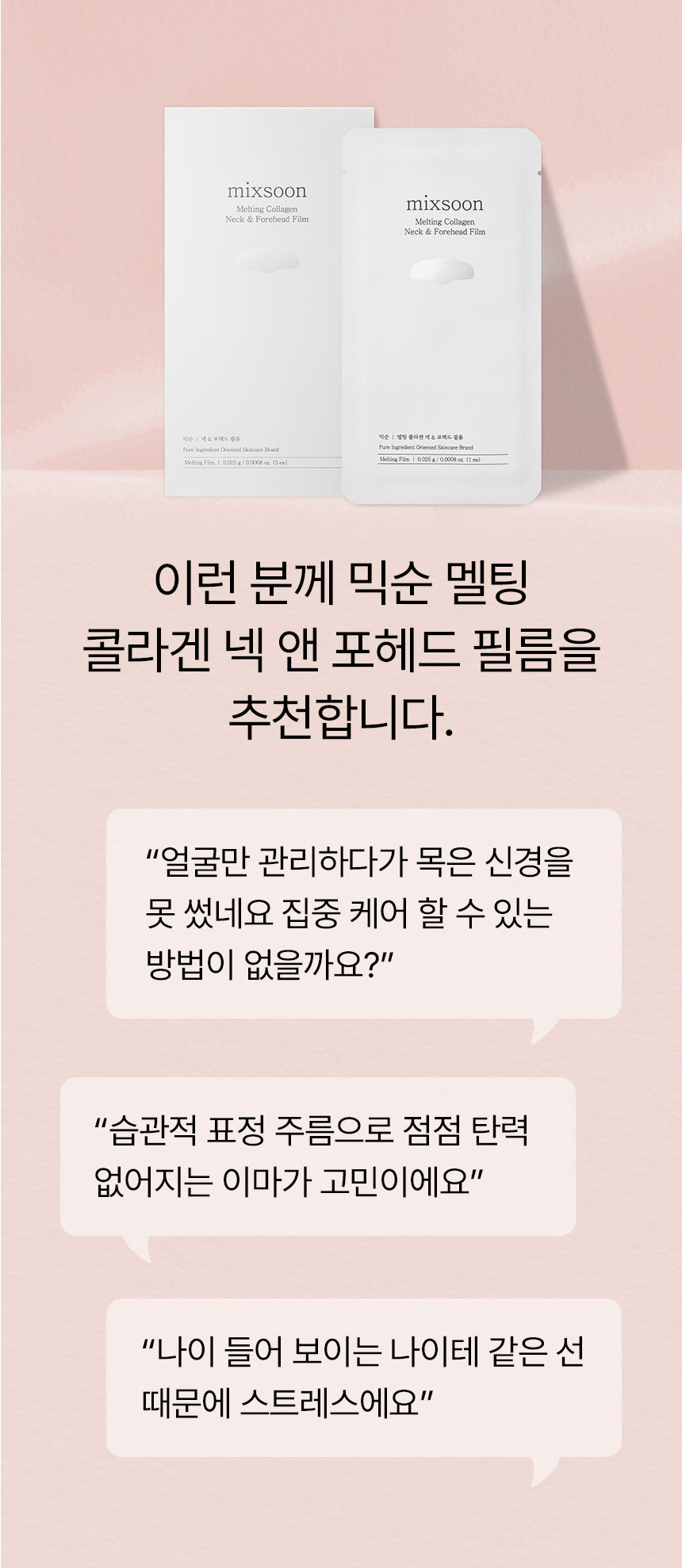 Achieve a youthful, radiant appearance with Mixsoon’s revolutionary Melting Collagen Neck & Forehead Film, specifically designed to care for the often-overlooked areas of your skincare routine.